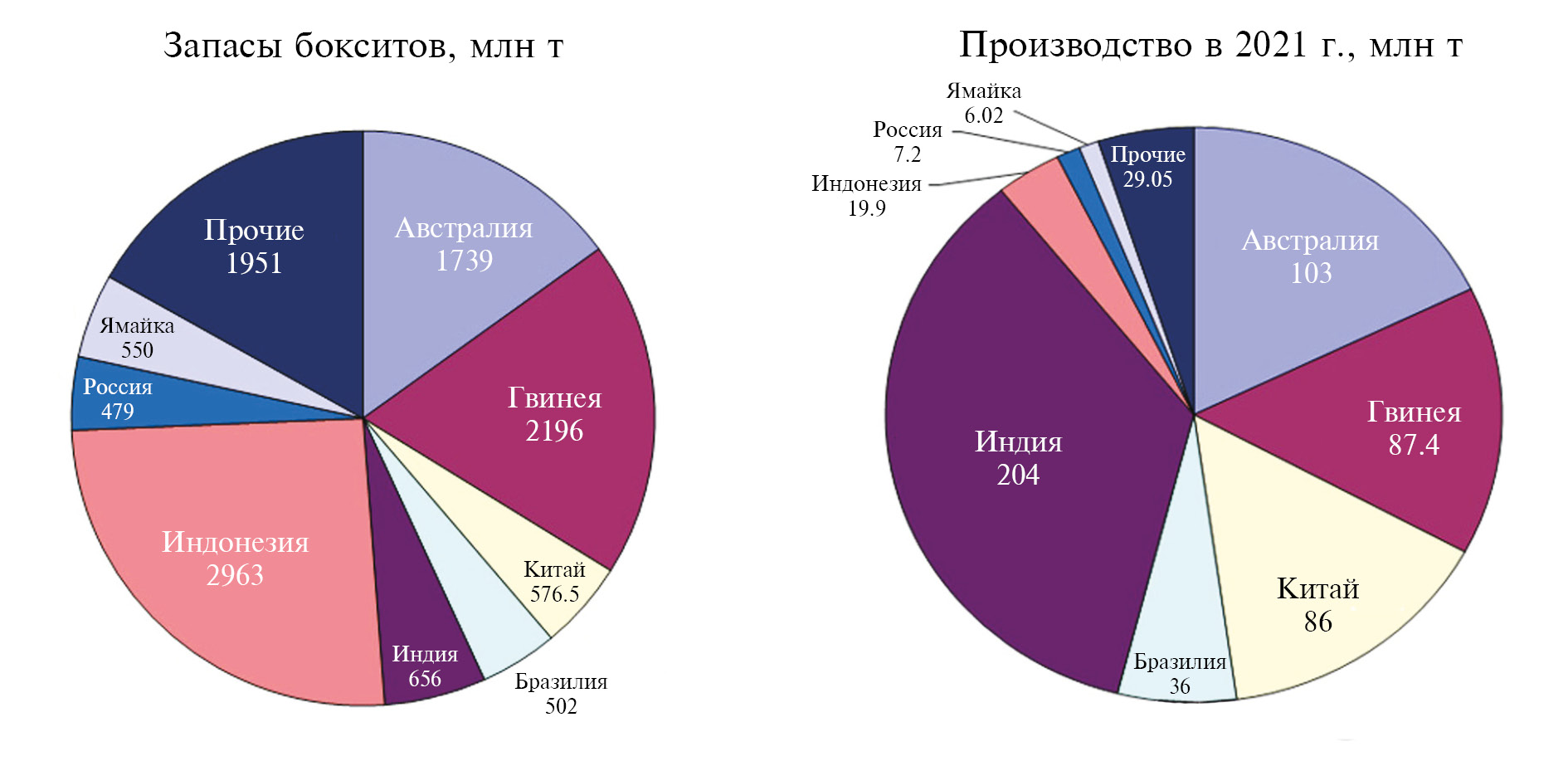 Россия занимает девятое месте в мире по запасам бокситов и седьмое – по их добыче. По выпуску глинозёма (в том числе из нефелиновых руд) она находится на пятом месте (2% мирового производства), по производству первичного алюминия – на втором (6%). Потребности алюминиевой промышленности в глинозёме на 35–40% (2.8 млн т) обеспечивают отечественные источники, остальное сырьё поставляется из-за рубежа: в 2021 г. импорт составил 4.74 млн т [5], в том числе около 450 тыс. т из Гвинеи.