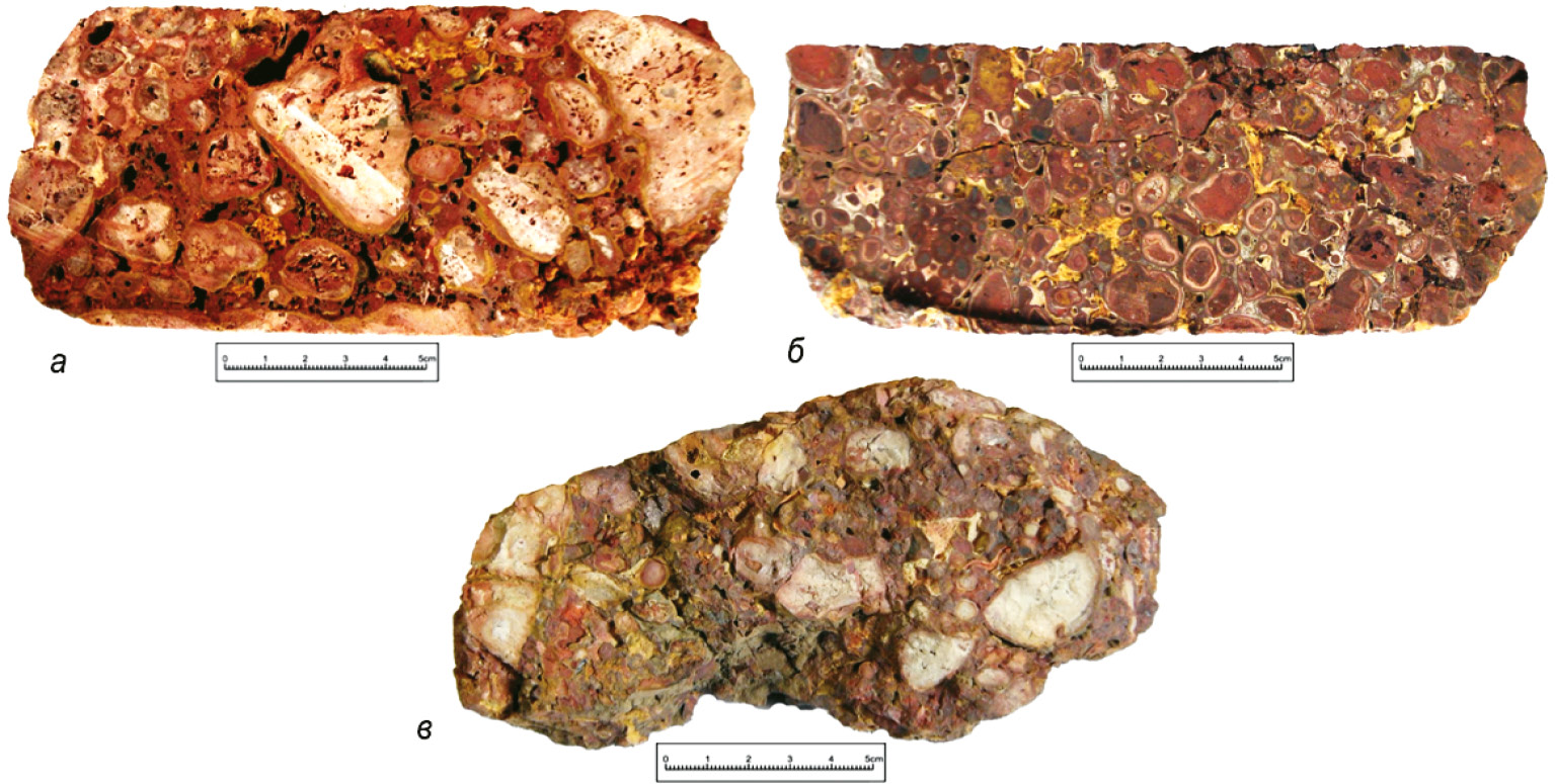 Рис. 3. Образцы обломочных бокситов и латеритов, образовавшихся по делювиальному чехлу на склоне месторождения Мехенгуи, провинция Фута Джалон-Мандинго [4] а – брекчиевидные бокситы по склоновому делювию; б – конгломерат-брекчиевые бокситы по делювиально-пролювиальному субстрату; в – кираса по обломочным отложениям делювиального шлейфа у основания склона