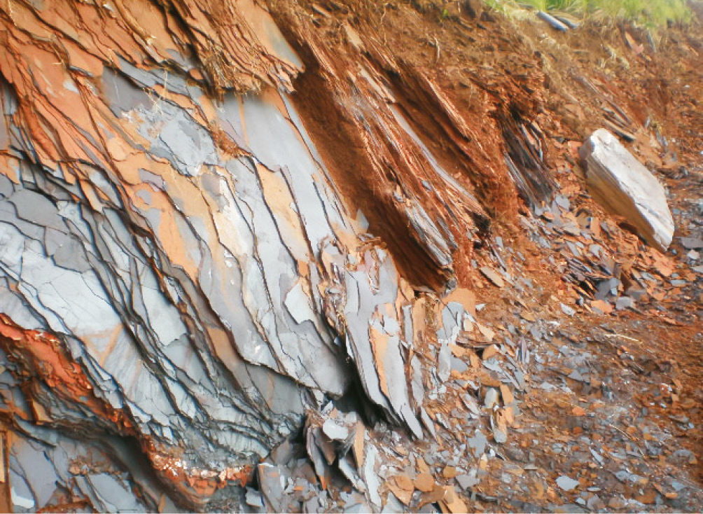 Рис. 4. Полосчатая гётит-гематитовая руда в борту траншеи, Северный Симанду [10]