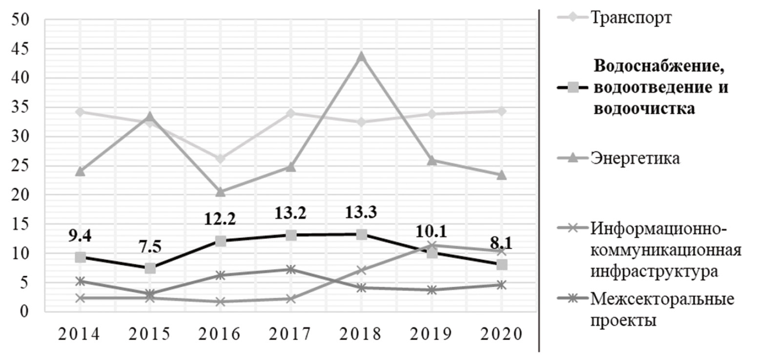 Другим значимым источником инвестиций выступает Инфраструктурный консорциум для Африки (ИКА) (The Infrastructure Consortium for Africa, ICA) – крупнейшая международная организация, которая аккумулирует средства для реализации различных инфраструктурных проектов, в том числе связанных с использованием водных ресурсов на территории стран Африки. ИКА составляет подробные отчёты, которые охватывают особенности, источники и сферы финансирования инфраструктурных проектов в Африке. Организация создана на 31 саммите G8 в 2005 г. с целью привлечения дополнительных средств для устойчивого развития всей африканской инфраструктуры5. Опираясь на данные ИКА, можно констатировать, что за 2014–2020 гг. проекты развития систем водоснабжения, водоотведения и очистки сточных вод в среднем финансировались на сумму 10.5 млрд долл. США в год (рис. 4) и заняли предпоследнее место среди всех инфраструктурных секторов по объёму привлекаемых инвестиций за данный период.