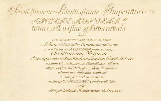 Из первой партии академических дипломов в СПбФ АРАН в материалах Конференц-архива сохранился отпуск диплома немецкого учёного Х. Вольфа. Он представляет собой гравированный оттиск на листе бумаги с рукописными чернильными вставками на латинском языке, размером 260 × 425 мм, датированный 1 июня 1735 г. [12, л. 1]. Приведём текст диплома в переводе Е.Ю. Басаргиной: “По Указу всепресветлейшей, державнейшей государыни императрицы Анны, самодержицы всероссийской, я, Иоганн Альбрехт Корф, действительный тайный советник Её императорского величества, властью, данной мне государыней, подтверждаю этим официальным дипломом, что Христиан Вольф, придворный советник державнейшего короля шведов, князя гессенского, уже прежде [в 1725 г.] общим решением всей Петербургской академии был объявлен членом этого сообщества, и наделяю его правами и привилегиями, предоставленными нашему сословию благоволением государей, в Петербурге 1 июня 1735 г.” (рис. 2) [13, с. 46].