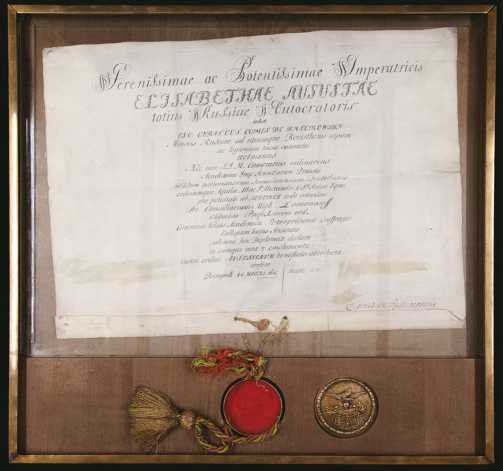 23 октября 1746 г. К.Г. Разумовский распорядился подготовить дипломы для следующих почётных членов: немецкого медика (1740) И.Ф. Шрейбера (1705–1760), служившего в Петербурге; голландского медика (1744) А. Каау-Бургаве (1715–1758); французского хирурга (1745) С.-Ф. Морана (1697–1773); французского государственного деятеля (1745) Ж. де Перара (1713–1766); французского писателя и философа (1746) Ф.-М. де Вольтера (1694–1778); итальянского математика и астронома (1746) Д.Д. Маринони (1676–1755). Были заказаны листы пергамена, для шнуров и кистей приобретены красные, зелёные и золотые нити. Из Конференц-архива взяты пять свободных капселей, а дополнительные заказаны у мастера серебряных дел Н. Дома. Его подмастерью М. Махаеву (1717–1770) было приказано написать дипломы на пергамене и затем направить их в канцелярию [17, л. 99–102, 121, 122]. 24 декабря 1746 г. президент подписал готовые дипломы: А. Каау-Бургаве и И.Ф. Шрейбер получили их лично [17, л. 103; 19, л. 167], а остальные были переданы через третьих лиц. В архиве сохранились черновые рукописные варианты всех шести дипломов 1746 г., а также диплом голландского медика А.Р. Санчеса, утверждённого в звании 1 сентября 1747 г., к оригиналу которого был привешен серебряный капсель с диплома Х.Ф. Гросса [17, л. 107 об., 108, 111–114, 116].