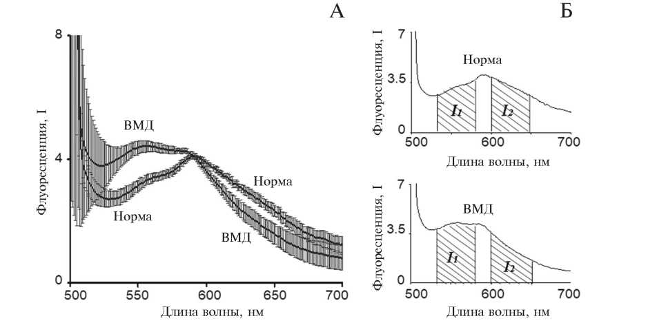 Рис. 3. Принцип спектрального анализа аутофлуоресценции глазного дна – доклиническая диагностика возрастной макулярной дегенерации [9, 18] А – сравнительный статистический анализ спектральных характеристик суспензий клеток ретинального пигментного эпителия из кадаверных глаз доноров без признаков патологии (норма) и с признаками возрастной макулярной дегенерации (ВМД). Длина волны возбуждения – 488 нм. Спектры флуоресценции нормализованы при 592 нм; Б – спектры флуоресценции суспензий клеток ретинального пигментного эпителия, полученных из отдельных кадаверных глаз здорового донора (норма) в возрасте 58 лет и донора с признаками возрастной макулярной дегенерации (ВМД) в возрасте 59 лет; определены интегральные интенсивности в спектральных диапазонах I1 (530–580 нм) и I2 (600–650 нм) Источник: рисунок адаптирован из [10].