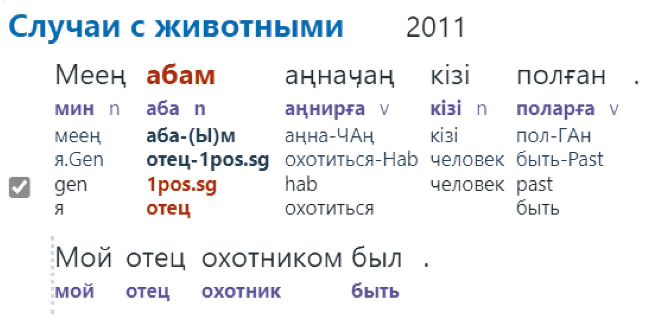 Как правило, корпуса включают морфологический анализ словоформ – указание на основную форму и пометы, которые говорят о том, какая именно форма представлена в предложении. На рисунке 1 показано одно из предложений устного корпуса диалектов хакасского языка18. Например, в словоформе абам выделяется суффикс -(Ы)м-, который является посессивным (притяжательным) показателем 1 лица единственного числа (помета 1pos. sg). Нередко корпуса предоставляют также перевод предложений на русский или английский язык, что облегчает их использование широким кругом лиц. Так, в устном корпусе хакасских текстов (рис. 1) имеется перевод на русский язык.