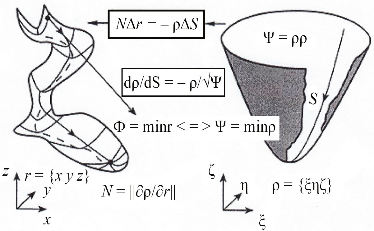 Рис. 4. Схема метода наискорейшего − параболического спуска, предложенного Т.М. Энеевым. Слева – “плохое” пространство с осями координат ох, оу, оz. Пунктирная линия отображает путь из начальной точки (вдоль короткой стрелки) к искомому значению функции Ф=min r. Любые ошибки движения приводят к смещению от пунктирной линии на склоны “оврага”, то есть движение снова идёт по склону, а не к точке функции Ф. В этом и заключается известный “овражный” эффект. Справа – “хорошее” пространство с осями координат ξ, η, ζ (предполагается, что параболоид Ψ = ρρ имеет минимум, совпадающий с минимумом функции Ф). Кратчайший спуск вдоль линий тока S ведёт к Ψ = ρρ. Связь векторов r{x, y, z}и ρ {ξ, η, ζ}описывает матрица N, с помощью которой соответствующее уравнение позволяет шаг за шагом отображать малые смещения ΔS вдоль линии тока в “хорошем” пространстве в соответствующие смещения Δr в “плохом” пространстве. Получаемое движение в нужную точку функции Ф произойдёт по сплошной линии вблизи дна “оврага”