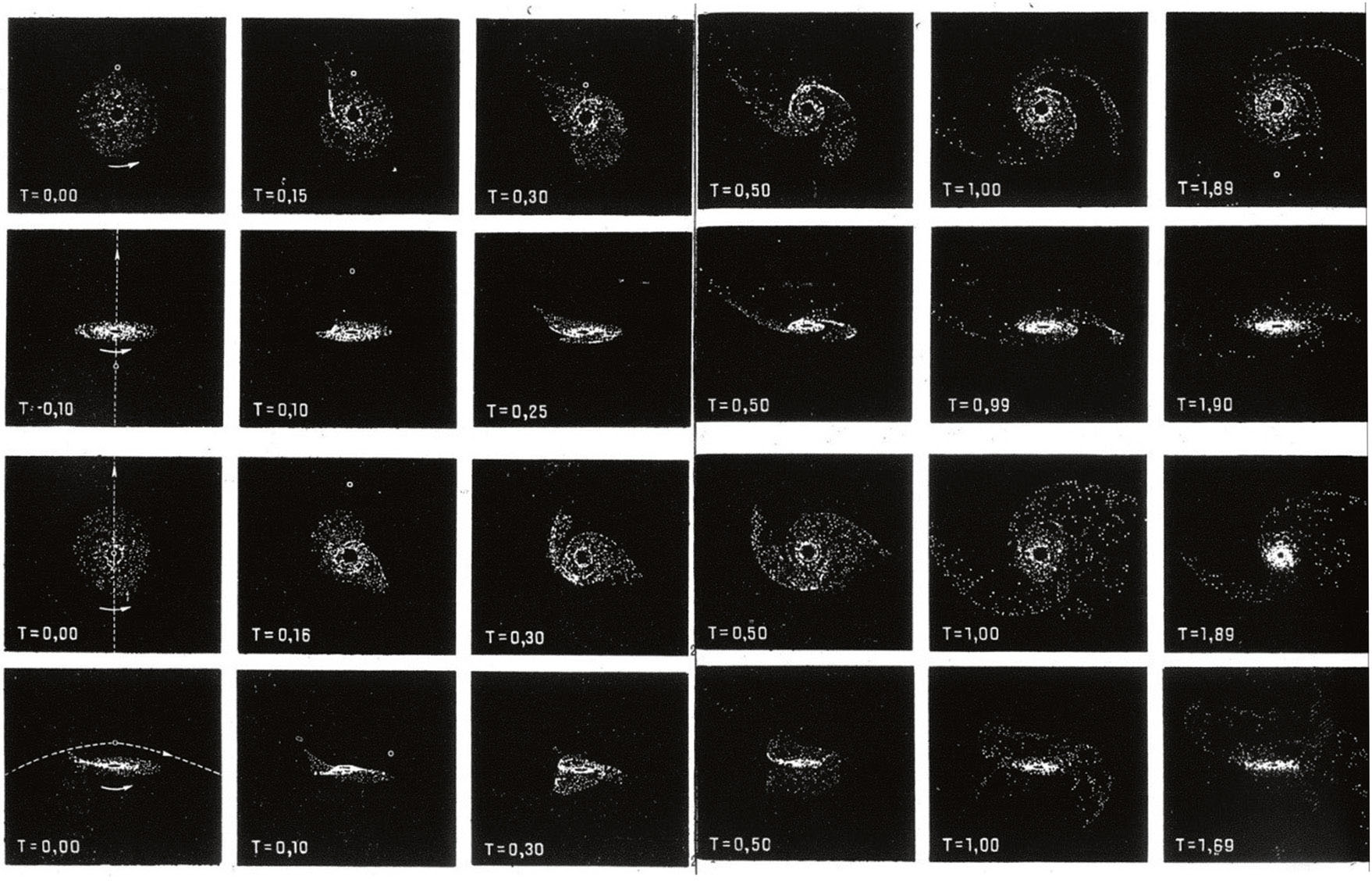 В 1970-е годы в связи с моделированием формирования Солнечной системы Т.М. Энеев (совместно с Н.Н. Козловым) разработал новый метод моделирования динамики больших дискретных систем. Он отличается экономией числа операций при вычислениях (для него число операций пропорционально N3/2, а не N3, как обычно), что достигается отбором групп взаимодействующих частиц N из общего их числа – для каждой области взаимодействия, на каждом его шаге. По просьбе астрофизиков метод применили в задаче эволюции галактик при их гравитационном взаимодействии (рис. 7). При моделировании в облаке из тысячи частиц, движущихся по почти круговым орбитам вокруг его ядра, при пролёте другой галактики образовывались спиральные ветви. Они не лежат в исходной плоскости движения частиц, что обычно невозможно при других механизмах их образования. На материале расчётов был снят фильм с экрана дисплея, имевший большой успех у учёных и у широкого зрителя: картинка с него служила заставкой телепередачи “Очевидное−невероятное”.