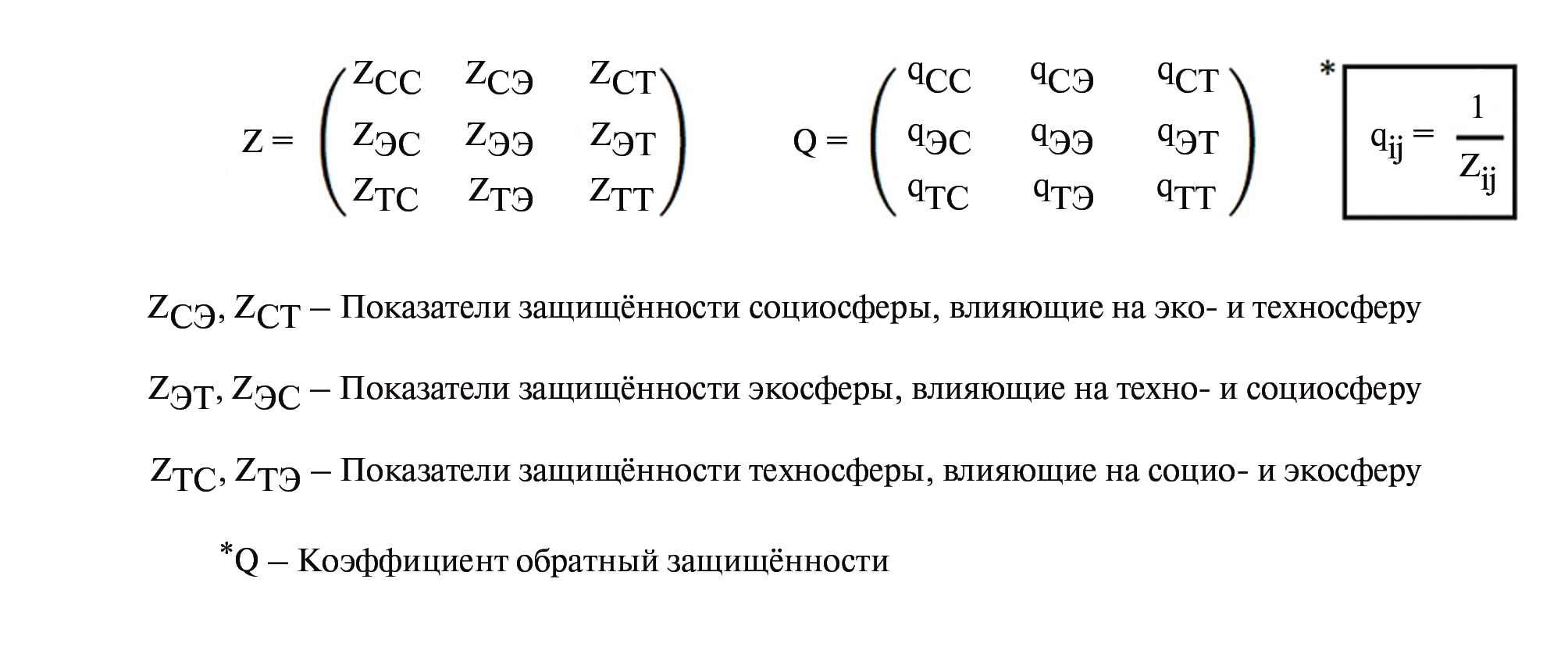 Деление показателей защищённости только по подсистемам С-П-Т-системы (см. табл. 1) – это своего рода упрощение, поскольку один и тот же показатель (zij) может выполнять функцию снижения рисков разных подсистем. Например, аварийно-спасательные формирования в случае возникновения аварии на объекте техносферы могут минимизировать ущерб для экосистемы и уменьшить количество погибших и пострадавших, то есть снизить риски социосферы.