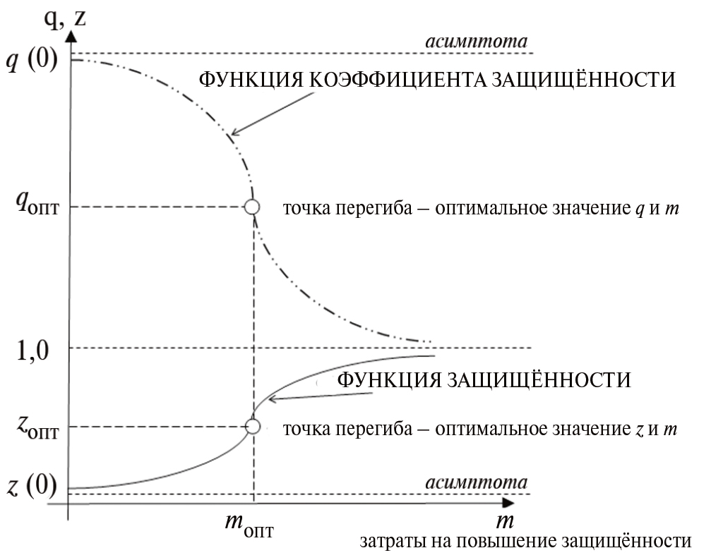 С представлением об изменении защищённости согласуется наличие у логистической функции верхней асимптоты, которая выходит на насыщение при больших значениях финансовых затрат m (рис. 2). Точка перегиба соответствует оптимальному значению защищённости, поскольку до её достижения происходит интенсивный рост функции zij(m) с последующим замедлением и ограничением zij(m) → 1.0. Поскольку при реализации новых мер безопасности показатель zij(m) увеличивается, то для задачи снижения риска целесообразно использовать коэффициент, зависящий от защищённости и при этом приводящий к снижению риска. Поэтому был введён коэффициент q, обратно пропорциональный защищённости. Коэффициенты защищённости qij(m) зависят от фактической защищённости территории для каждого элемента матрицы zij(m) (см. рис. 1).