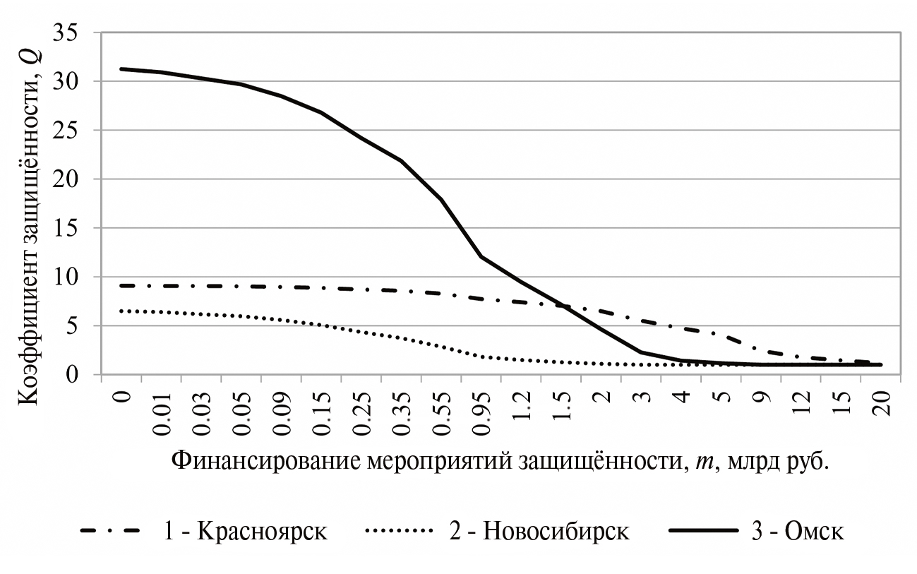 Фактические значения коэффициентов защищённости оказались больше, чем значения точек перегиба (рис. 4), что означает защищённость на уровне, где повышение финансирования приведёт к незначительному её росту. Эти значения могут быть скорректированы путём уточнения знаменателя в формуле (3), который характеризует предельное значение каждого показателя, формирующего уровень защищённости территории. В целом уровень текущей защищённости Красноярска, Новосибирска и Омска высокий, но его поддержка не осуществляется, вложения средств программ развития недостаточны, не выполняется оценка эффективности их расходования.