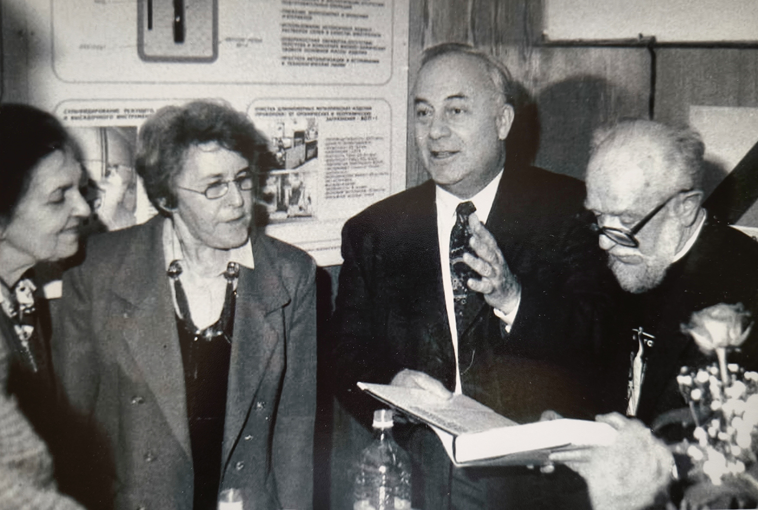 Николай Дмитриевич Зелинский (в центре) с дочерью Раисой Николаевной Зелинской-Платэ (справа), зятем Альфредом Феликсовичем Платэ (слева) и внуками Николаем (справа) и Феликсом (слева). 1946 г.