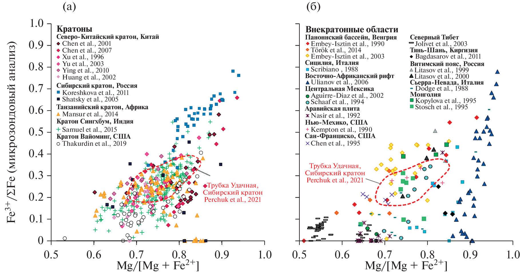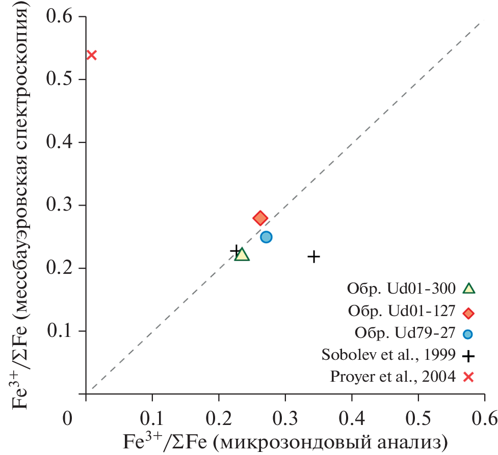 12. Dyar M.D., Breves E.A., Emerson E. et al. Accurate determination of ferric iron in garnets by bulk Mössbauer spectroscopy and synchrotron micro-XANES // Amer. Mineral. 2012. V. 97. № 10. P. 1726–1740.
