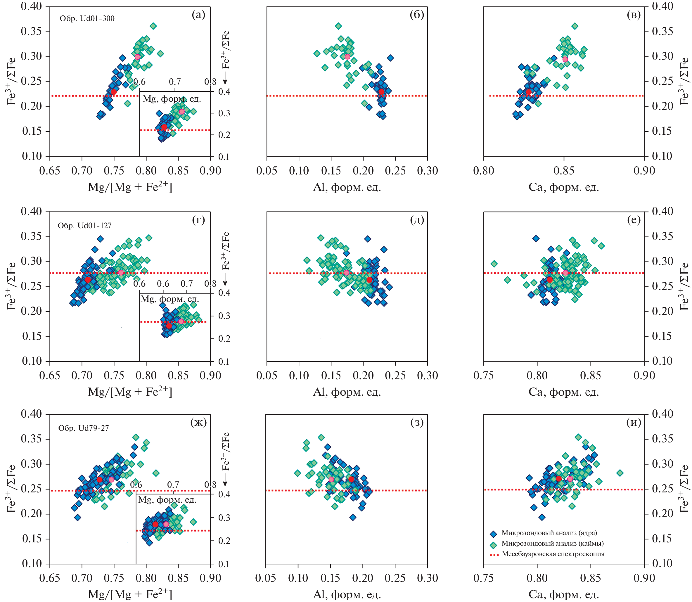 Эгириновый компонент (NaFe3+Si2O6) в клинопироксенах, обусловленный вхождением Fe3+ в их структуру, влияет на корректность восстановления P-T условий формирования пород высоких ступеней метаморфизма, а также позволяет оценивать окислительно-восстановительные условия их образования. Наиболее часто содержание этого компонента в клинопироксенах устанавливается на основе кристаллохимических пересчетов микрозонодовых анализов. Однако в некоторых публикациях, посвященных эклогитам, где результаты пересчетов клинопироксенов сравнивались с данными мессбауэровской спектроскопии, были выявлены заметные отличия измеренных и рассчитанных отношений Fe3+/ΣFe, способные существенно влиять на результаты геотермометрии. В настоящей работе приводятся результаты измерений методом мессбауэровской спектроскопии фракций клинопироксенов, отобранных из трех образцов гранат-клинопироксеновых гранулитов кимберлитовой трубки Удачная. Измеренные в клинопироксенах отношения Fe3+/ΣFe = 0.22–0.26 соответствуют 6–10 мол. % эгирина. Эти оценки хорошо согласуются со значениями, полученными при пересчете микрозондовых анализов клинопироксенов из этих же образцов методом баланса зарядов. Вследствие этого мы полагаем, что кристаллохимические пересчеты микрозондовых анализов клинопироксенов из неэклогитовых пород позволяют корректно оценивать содержание в них Fe3+. Аналогичный пересчет микрозондовых анализов клинопироксенов из коровых ксенолитов из других регионов, а также из ферробазальтов трапповых провинций, даек ферродолеритов и ксенолитов габброидов (близких по валовому химическому составу ко многим нижне-средне-коровым ксенолитам) выявил существенные количества ранее неучтенного эгирина в них (до 13 и 4–9 мол. %, соответственно), что раскрывает потенциал для восстановления редокс-условий во многих породах.