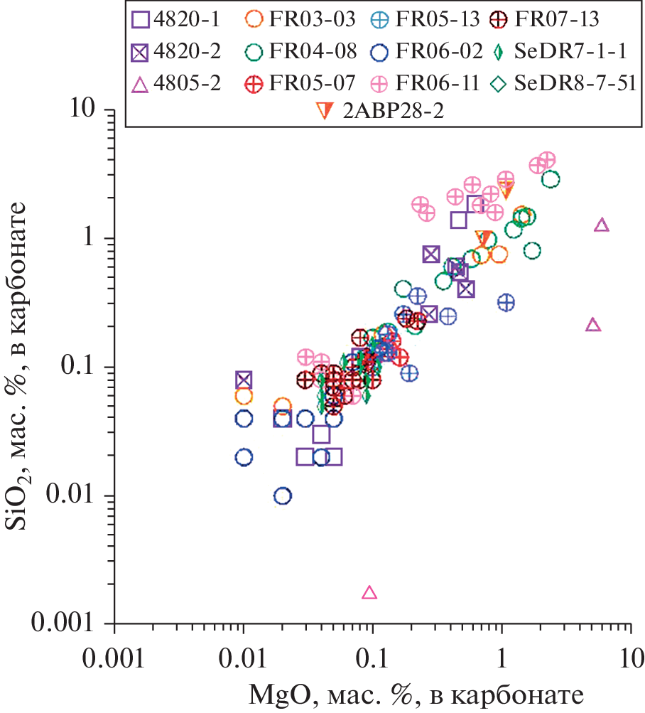 - Da Costa I.R., Barriga F.J.A.S., Taylor R.N. Late seafloor carbonate precipitation in serpentinites from the Rainbow and Saldanha sites (Mid-Atlantic Ridge) // Eur. J. Mineral. 2008. V. 20. P. 173–181.
