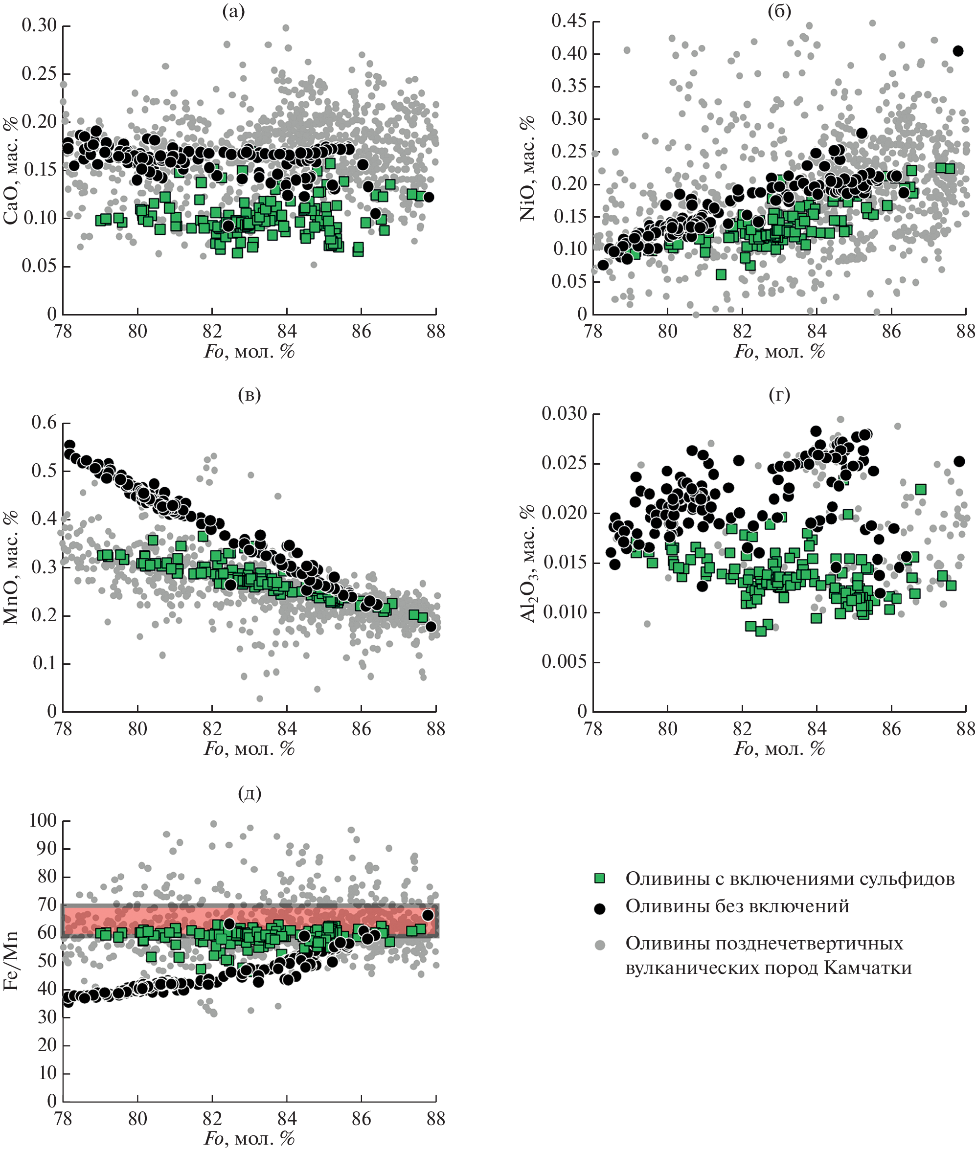 The role and conditions of liquid immiscibility and crystallization of sulfide phase during evolution of subduction related magmas remains to be a debated topic, which bears relevance to mechanisms of porphyry copper deposit formation and evolution of the continental crust. We studied rare volcanic rocks with inclusions of magmatic sulfides in olivine – the basalts of Medvezhya Mount in the Avachinsky group of volcanoes. The rocks belong to primitive (Mg# = 66 mol. %) middle-K island arc olivine basalts. Olivine with normal zoning predominate (~98%) among phenocrysts. The olivine compositions are typical for Kamchatka basalts, except for an unusual trend of increase of MnO content from 0.20 to 0.55 wt. % and decrease of Fe/Mn from 60 to 35 with change of olivine composition from Fo87.8 to Fo78.2. Olivines of this group contain numerous inclusions of minerals of the spinel group varying in composition from chromium spinel to magnesian magnetite. Olivine phenocrysts with sulfide inclusions are characterized by the absence or weak reverse zoning and reduced contents of Ca, Ni, Mn, Cr, and Al. The estimated crystallization temperatures for olivines of the prevailing type are 1036–1241°C, for sulfide-bearing olivines – 1010–1062°C. The data suggest that crystallization of the main olivine population occurred under relatively shallow conditions and was accompanied by strong oxidation of the magmas. On the contrary, the zoning and composition features of sulfide-bearing olivine suggest its xenogenic origin and probable crystallization at conditions of deep crust from low temperature water-rich and/or low-Ca magmas. The results obtained confirm the possibility of saturation of oxidized island-arc magmas with sulfide phase at lower crustal conditions, but show that this process is rare and not typical for low-pressure crystallization stage.