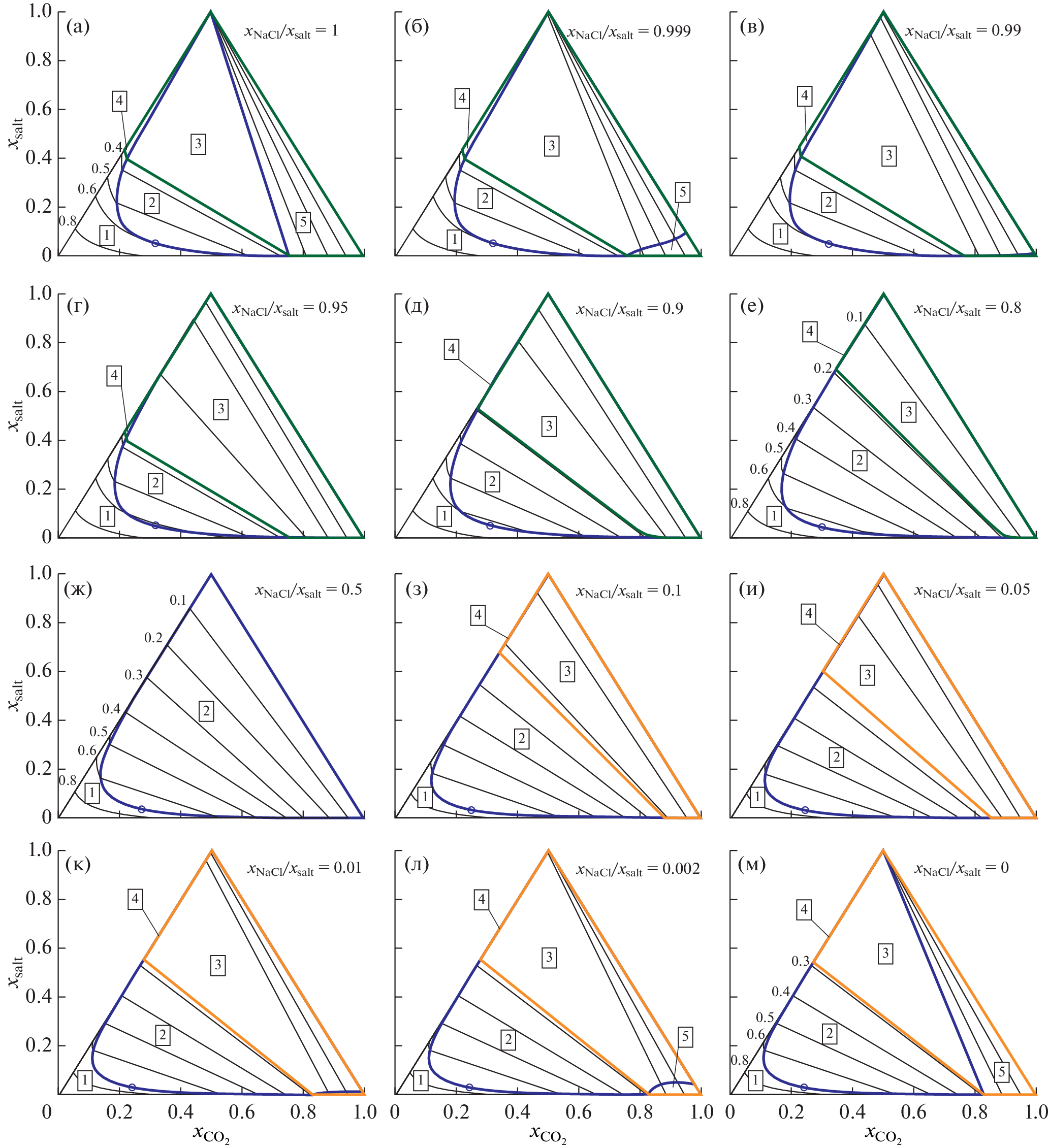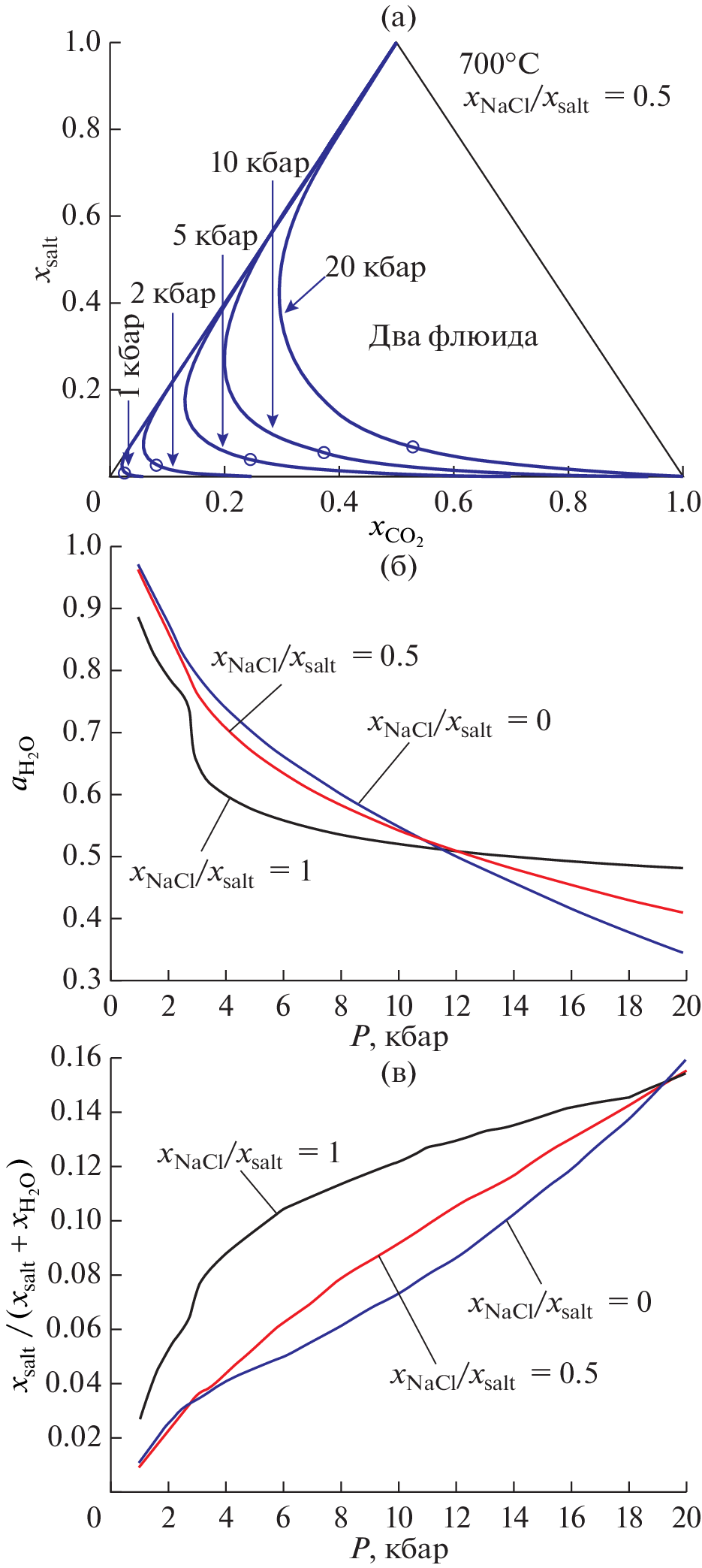 {\vphantom {{{{x}_{{{\text{NaCl}}}}}} {({{x}_{{{\text{NaCl}}}}} + {{x}_{{{\text{CaC}}{{{\text{l}}}_{{\text{2}}}}}}})}}} \right.} {({{x}_{{{\text{NaCl}}}}} + {{x}_{{{\text{CaC}}{{{\text{l}}}_{{\text{2}}}}}}})}}.\) Исследованы изменения состава и плотности сосуществующих флюидных фаз при постоянной активности воды и изменении полного состава системы. Получен набор фазовых диаграмм на сечениях H2O–NaCl–CaCl2 при изменении мольной доли CO2. Выявлена зависимость от давления для максимальной активности воды в области сосуществования несмесимых флюидных фаз при различном солевом составе системы. Термодинамическое поведение системы со смешанным составом соли в значительной степени отличается от поведения систем с одним солевым компонентом вследствие снятия ограничений, вытекающих из меньшего числа компонентов в тройной системе.