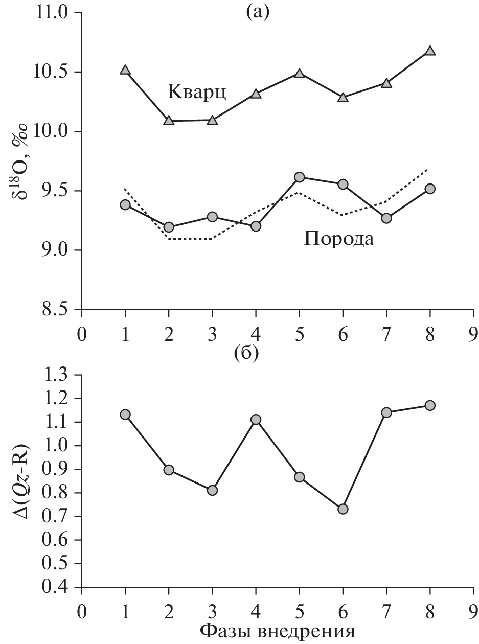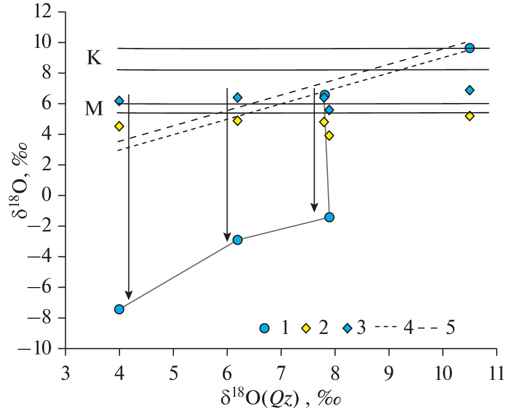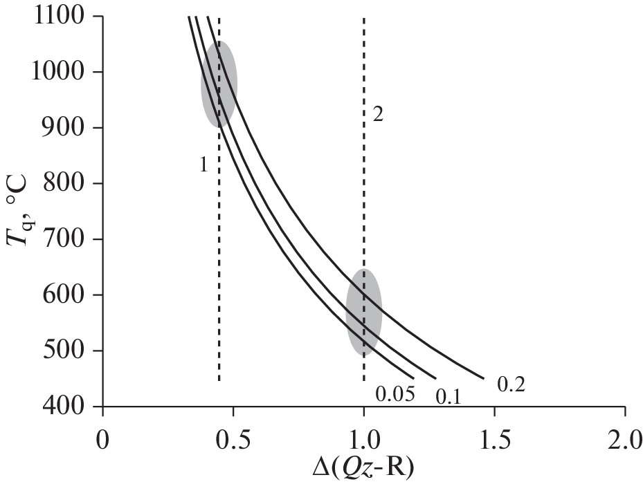 The problems associated with the use of quartz and zircon as proxy minerals for the reconstruction of δ18O values in acidic melts are considered. It is shown that the correction values Δ(Qz-R) and Δ(R-Zrn) used for the reconstructions are not strictly constant and depend on the mineral composition of the rock and the closing temperature of the oxygen isotopic system of the proxy mineral (Tq, Tz). For Δ(Qz-R), an equation for the calculation is proposed, taking into account these factors, and it is shown that, under a number of conditions, the approximation of this correction by a constant value gives consistent results. To estimate Δ(R-Zrn), an approach has been proposed that consists in calculating the weighted average fractionation coefficient and estimating Tz using a zirconium thermometer. An analysis of the advantages and limitations of the use of quartz and zircon as proxy minerals has been carried out.