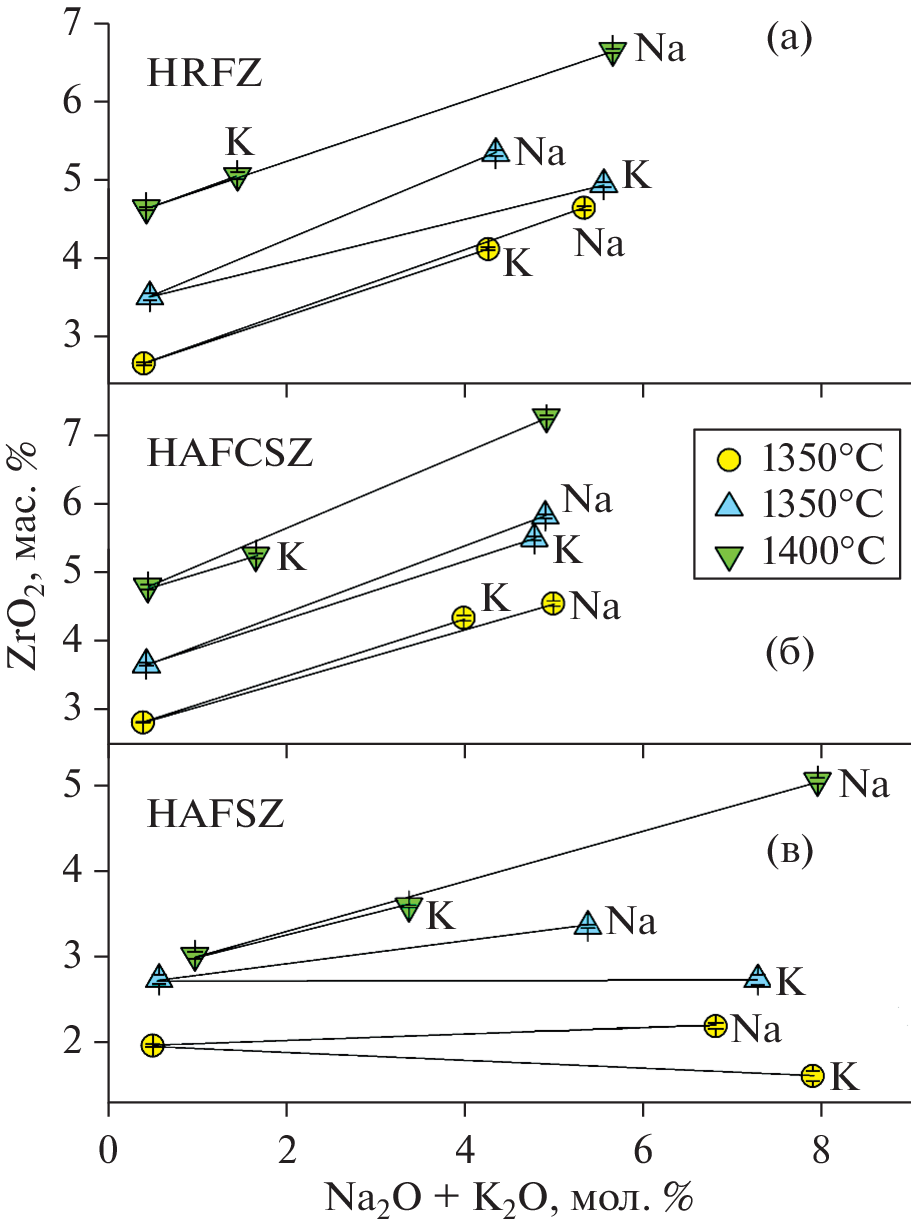 The experimental study of the effects of alkalis content on zircon solubility in multicomponent model silicate melts was conducted in temperature range 1300–1400°С and at 1 atm total pressure. It was demonstrated that the addition to the melt of Na2O and K2O results in comparable increase of zircon solubility. The advantages and disadvantages of the parameters describing zircon solubility are shortly discussed.