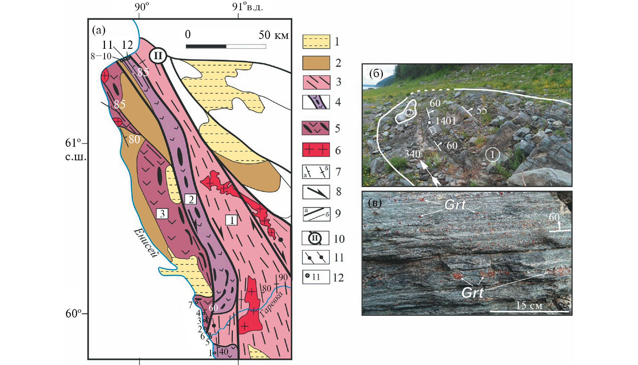 1 – чехол (Pz–Kz); 2 – молассы (NP2–3); 3 – бластомилониты (NP) по породам гаревского комплекса (PP) (зона 1); 4 – высокобарические метабазит-ультрабазитовые и апогнейсовые бластомилониты (зона 2); 5 – метабазитовые и молассовые комплексы Исаковского террейна (зона 3); 6 – гранитоидные комплексы; 7 – элементы залегания сланцеватости: наклонные (а) и вертикальные (б); 8 – направление тектонических движений (NP); 9 – тектонические нарушения: разломы (а), прочие границы (б); 10 – Приенисейский разлом; 11 – ставролит-гранат-кианитовые тектониты; 12 – точки отбора образцов. Цифры в кружках на рис. 2б: 1 – гранат-амфиболовые бластомилониты; 2 – будины ультрабазитов.