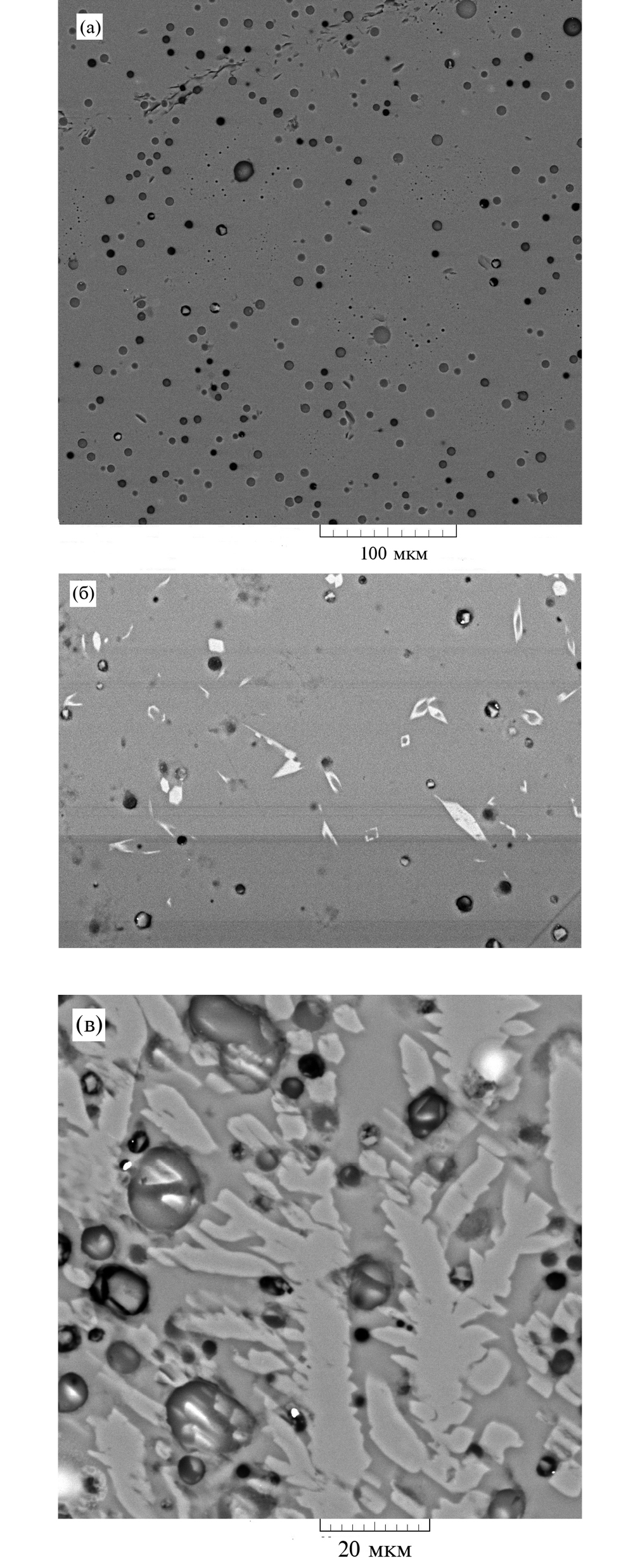 Рис. 1. Фото в обратнорассеянных электронах стекол из продуктов опытов 2-8 (а), 5-3 (б) и 4-5 (в). Более яркие зерна на рисунках (б) и (в) – закалочный клинопироксен, близкий по составу к диопсиду. Масштаб рисунков (б) и (в) одинаковый.