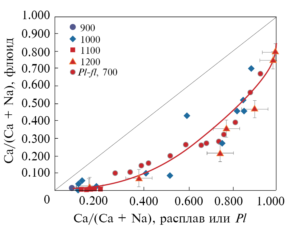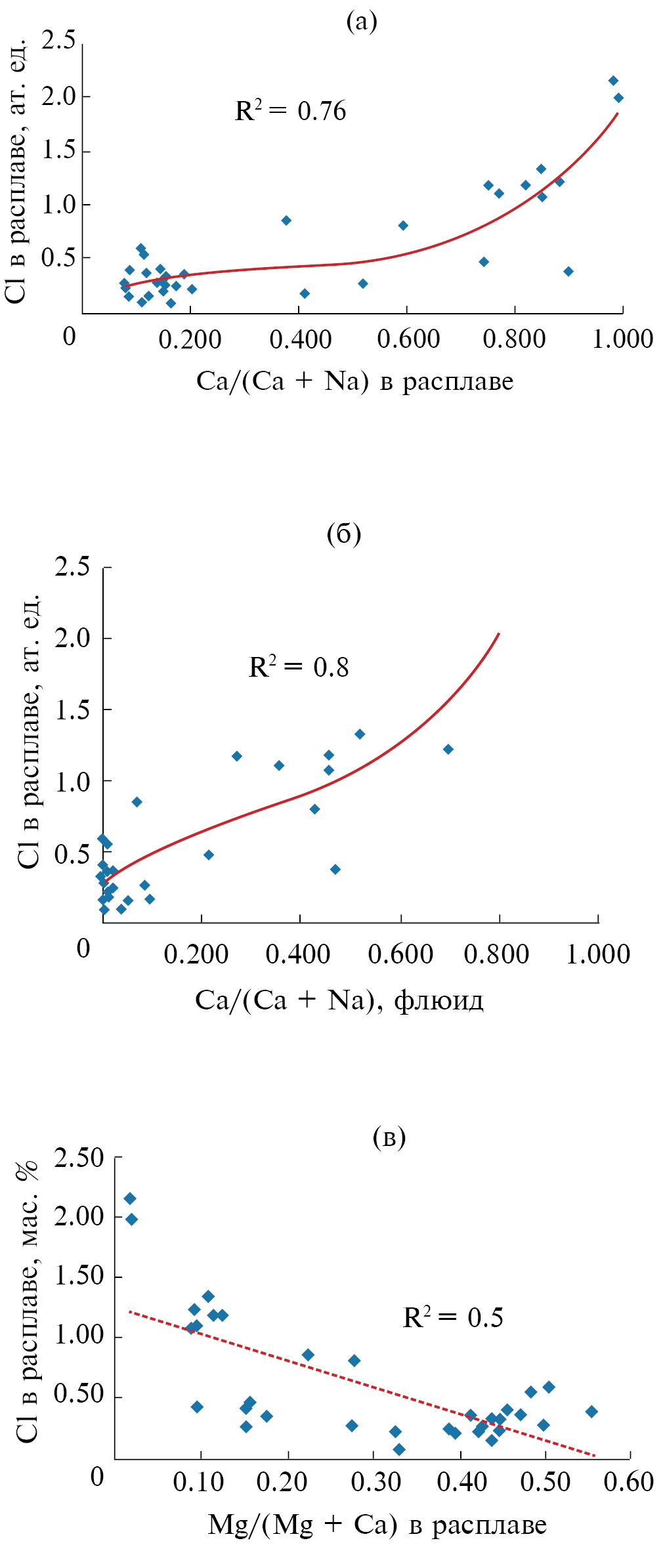 Растворимость Cl в силикатных расплавах исследовалась в многочисленных экспериментальных работах (Webster et al., 2015; Dolejš, Zajacz, 2018; Чевычелов, 2019; Hsu et al., 2019; Thomas, Wood, 2023 и ссылки там). На основе большого набора экспериментальных данных, полученных для сложных по составу систем, предложены эмпирические уравнения, описывающие растворимость Cl как функцию температуры, давления и состава кислых (Луканин, 2015; Dolejš, Zajacz, 2018) и основных (Webster et al., 2015; Thomas, Wood, 2023) расплавов. В работе (Witham et al., 2012) была предложена модель разделения Cl между расплавами основного состава и сложным C-O-H-S-Cl флюидом. Гораздо менее изученным является распределение катионов между флюидами и хлорсодержащими расплавами – проблема, имеющая принципиальное значение для моделирования эволюции состава флюида, отделяющегося при магматической дегазации. Отсутствуют и модели растворимости хлора в расплавах, которые можно было бы использовать в наиболее распространенных петрологических пакетах программ по расчетам фазовых равновесий в природных системах, что затрудняет или делает невозможным строгий учет эволюции флюидно-магматических систем.