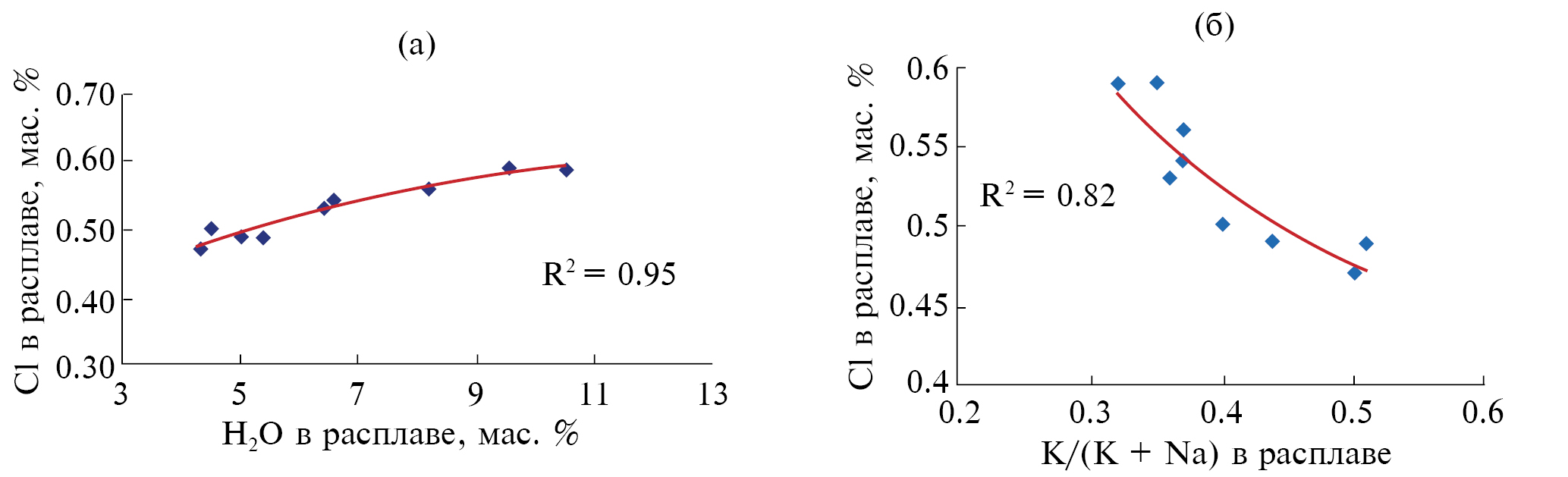 Уменьшение растворимости Cl с ростом отношения K/(K + Na) в расплаве (рис. 4б) хорошо согласуется с результатом, полученным В.Ю. Чевычеловым (2019) в опытах при умеренном давлении (1–3 кбар). Важным следствием этого результата является то, что при достижении насыщения от хлорсодержащих гранитных магм первыми должны отделяться относительно обогащенные калием флюиды, способные вызывать калиевый метасоматоз при взаимодействии с вмещающими породами.