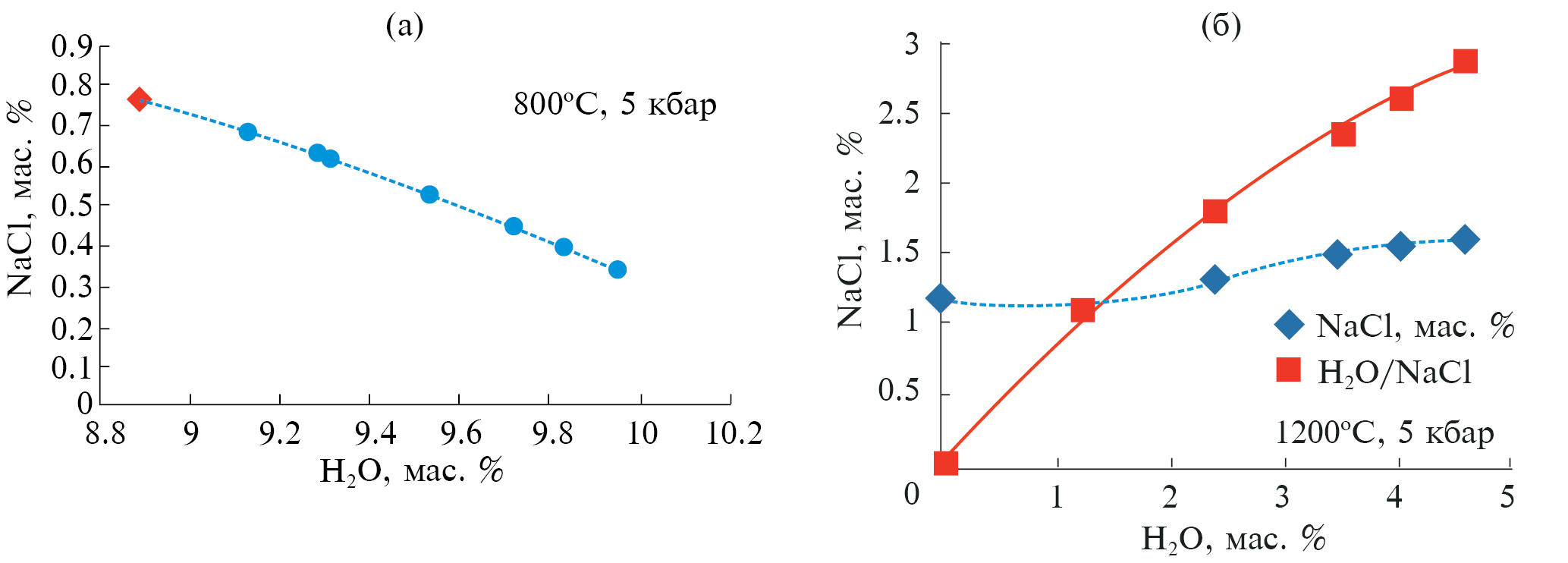 Чтобы полнее выявить влияние содержания H₂O на растворимость NaCl в расплаве, мы рассчитали концентрации этих компонентов в альбитовом расплаве при 5 кбар и 1200°С – температуре, при которой силикатный расплав существует при любой концентрации соли во флюиде, вплоть до безводного расплава NaCl (Tenner et al., 2007). На рис. 6б показаны результаты расчета для произвольно выбранного валового содержания соли, X(NaCl) = 0.5 и переменного содержания воды, X(H2O) от 0 до 0.4. Видно, что для выбранных условий расчета зависимость содержания соли в расплаве альбита от содержания воды совсем другая, чем на рис. 6а, – при низком содержании H₂O (до 1 мас. %) концентрация NaCl немного меньше, чем в равновесии с сухим солевым расплавом, а затем медленно возрастает. При этом отношение H₂O/NaCl быстро растет (в пределе приближаясь к бесконечности для чисто водного флюида).