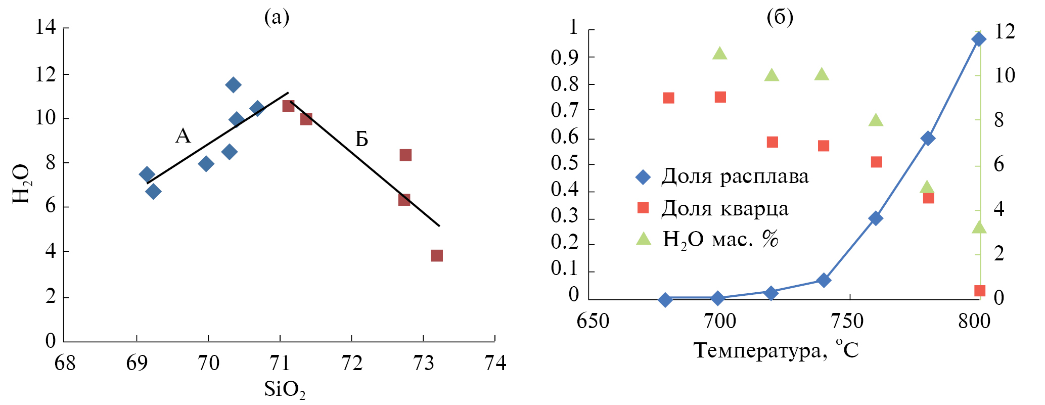 Многочисленные эмпирические данные по составу расплавных и флюидных включений в минералах указывают на сложную историю формирования рудных месторождений, так или иначе связанных с гранитоидным магматизмом (см. недавние обзоры Blundy et al., 2021; Goldfarb, Pitcairn, 2022). В качестве примера на рис. 7а показаны оценки содержания H₂O и кремнезема в расплавных включениях в кварце гранитов Верхнеурмийского массива Баджальской вулкано-плутонической зоны, с которой связаны олово-вольфрамовые месторождения (Бортников и др., 2019). Отчетливо выделяются два разнонаправленных тренда – с положительной (А) и отрицательной (Б) корреляцией между этими параметрами. Тренд А хорошо объясняется последовательным захватом включений на фоне кристаллизационной дифференциации в глубинном магматическом очаге (рис. 7б): ранний кварц, образовавшийся при 780–760°С, захватил расплав, содержавший примерно 7 мас. % H₂O.