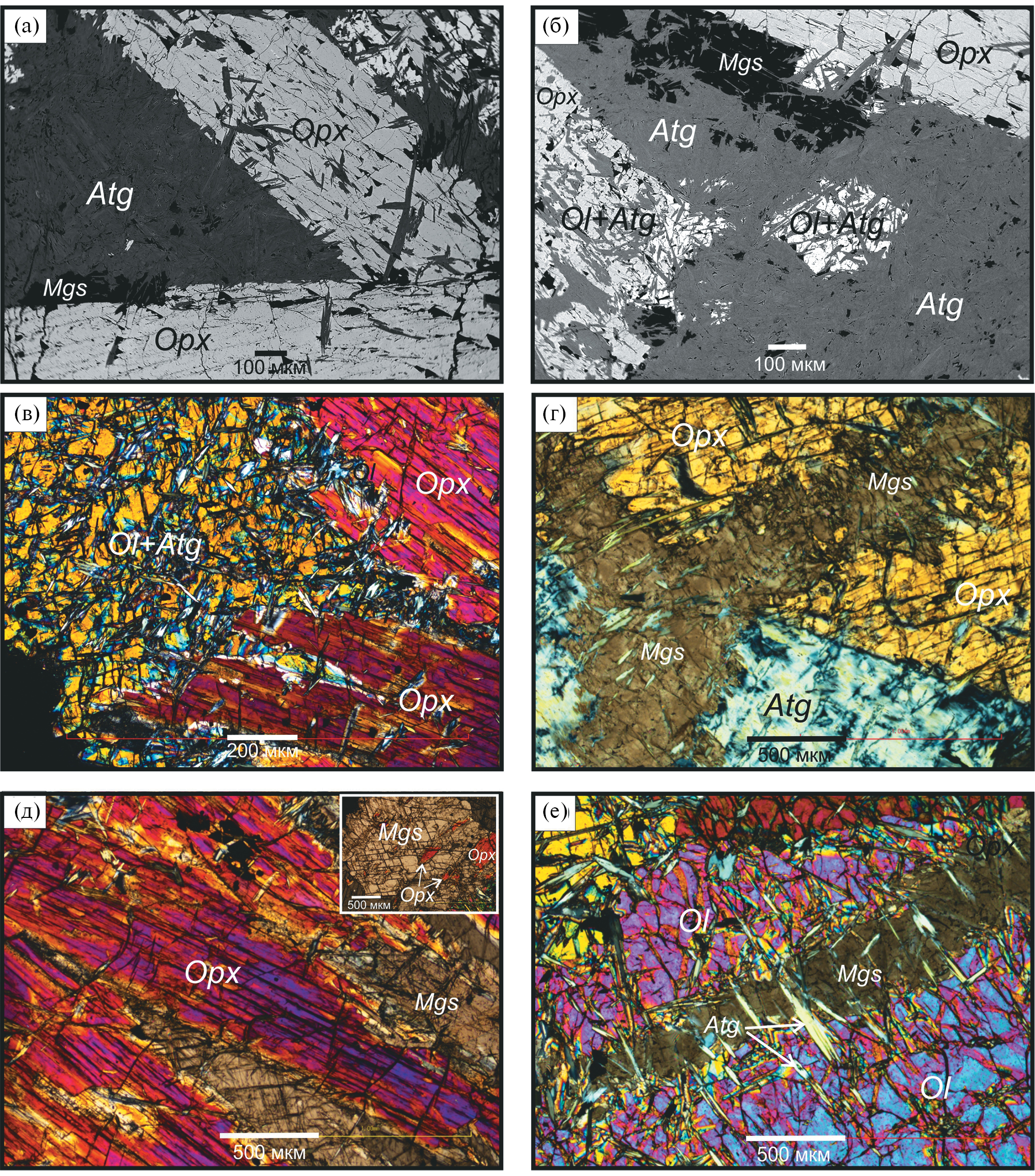 Рис. 6. Петрографические и микроструктурные особенности магнезит-антигоритового метагарцбургита (обр. МК 3.25). (а) – субидиоморфные кристаллы ортопироксена, сосуществующие с плотной листоватой массой антигорита. (б) – частичное замещение оливина и магнезита антигоритом и равновесные соотношения с ортопироксеном. (в) – ортопироксен, замещающий реликтовый оливин. (г) – жилы магнезита, пронизывающие ортопироксен и антигорит. (д) – замещение ортопироксена магнезитом, имеющее вид срастания; на врезке – более развитая стадия этого замещения. (е) – жила магнезита в оливине; иглы антигорита пронизывают жилу и вмещающий оливин. (а) и (б) – изображения в обратнорассеянных электронах, (в)–(е) – оптическое изображение, николи скрещены.