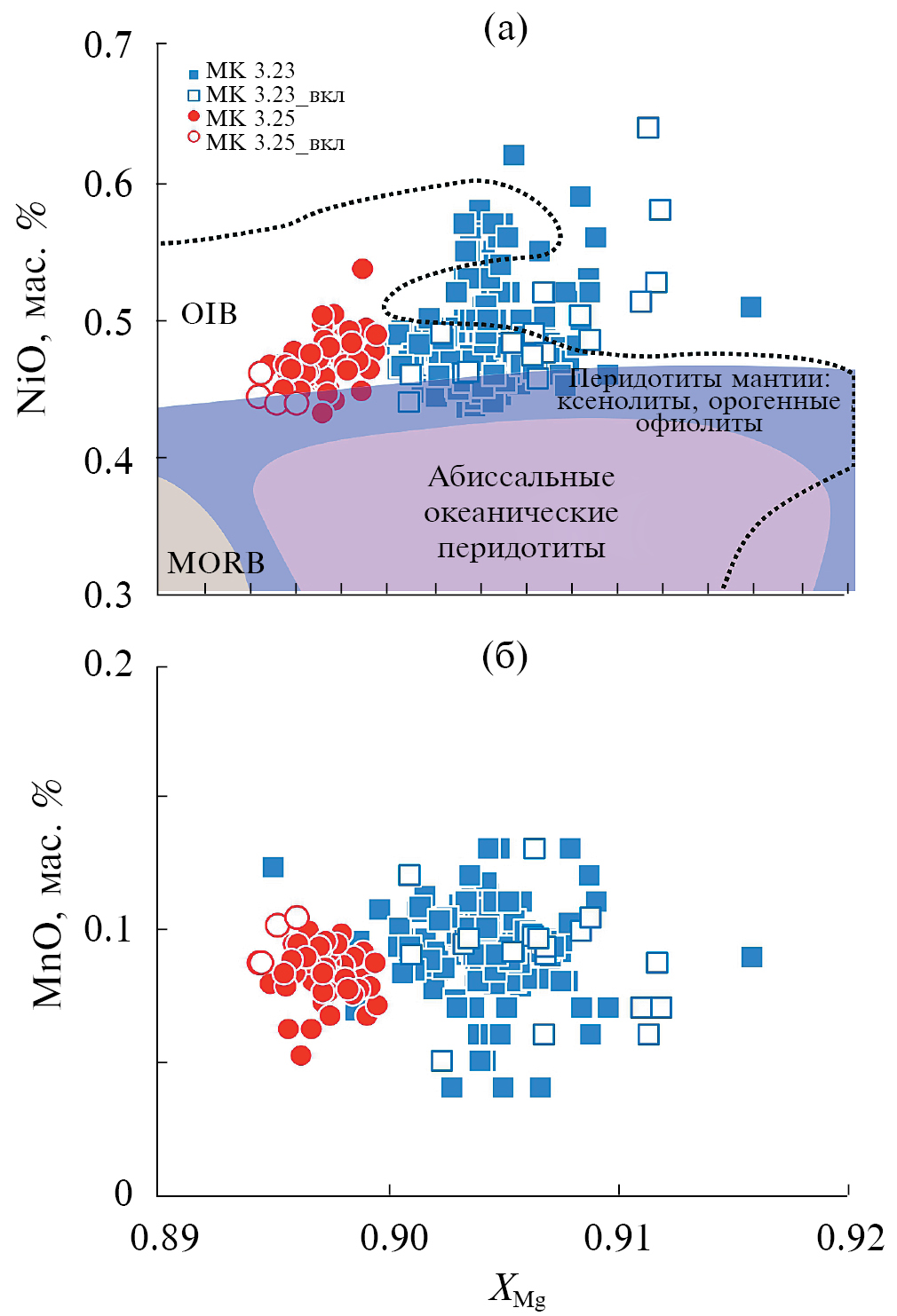 Рис. 7. Параметры состава оливина в крупных зернах и во включениях в ортопироксене из обр. MK 3.23 и МК 3.25. (а) Диаграмма XMg–NiO (мас. %), (б) диаграмма XMg–MnO (мас. %). Фрагменты полей составов оливина из перидотитов мантии (лиловое), абиссальных перидотитов (сиреневое), базальтов СОХ (MORB, бежевое) и базальтов океанических островов (OIB, точечная пограничная линия, бесцветное) (Sobolev et al., 2005).