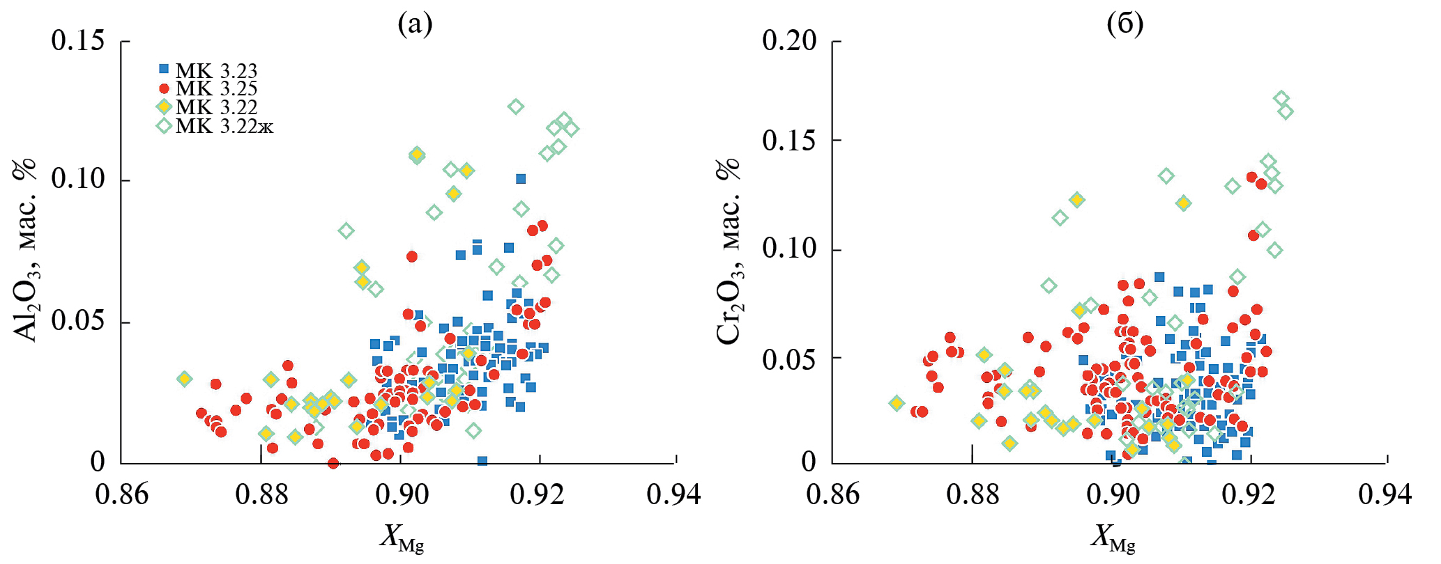 Рис. 8. Параметры состава ортопироксена из метаультрамафитов (обр. MK 3.23, МК 3.25, МК 3.22ж). (а) Диаграмма XMg–Al₂O₃ (мас. %), (б) диаграмма XMg–Cr₂O₃ (мас. %). Обр. МК 3.22ж –ортопироксен из антигоритовой жилы.
