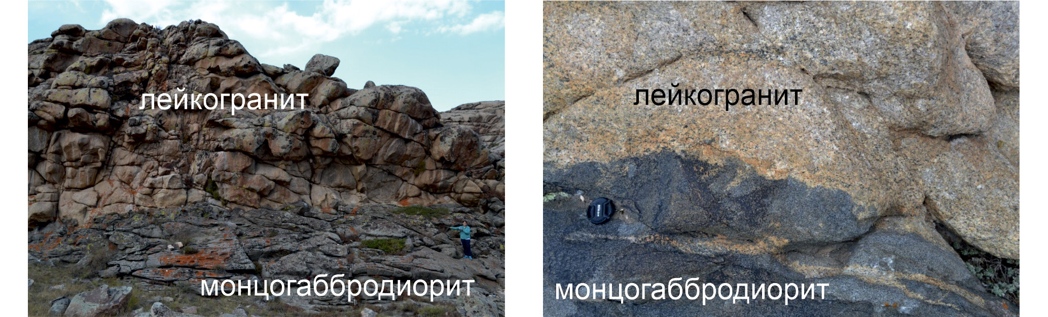 Рис. 2. Обнажения пород массива Акжайляу; минглинг–контакты между лейкогранитами и монцогаббродиоритами.