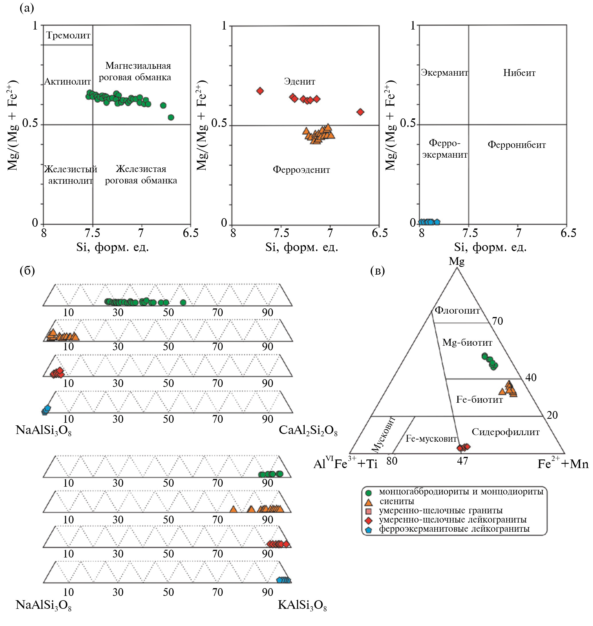 Рис. 4. Состав породобразующих минералов пород массива Акжайляу: (а) – составы амфиболов, классификация по (Leake et al., 1997); (б) – состав плагиоклазов (сверху) и полевых шпатов (снизу); (в) – состав слюд.