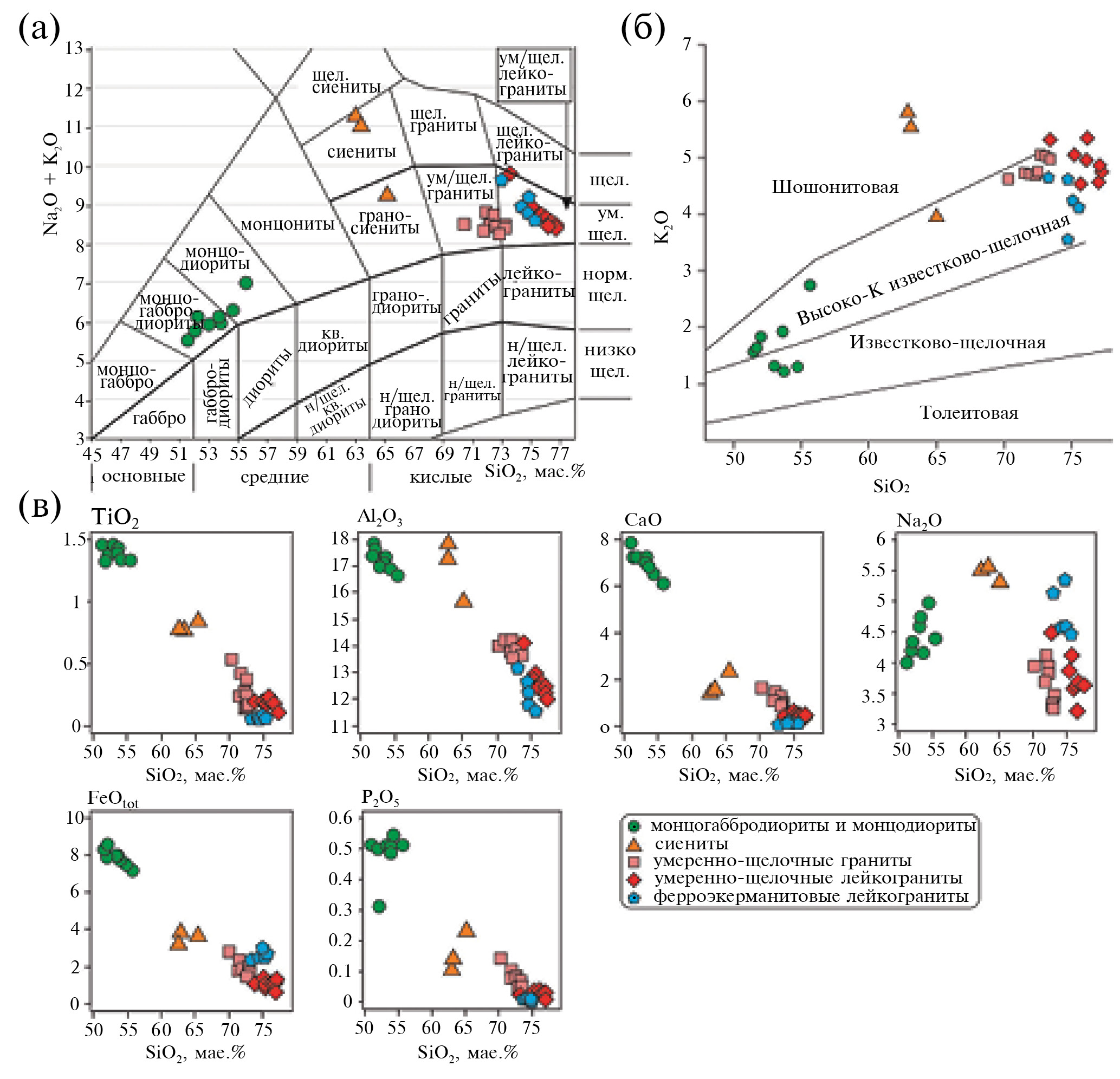 Рис. 5. Состав петрогенных компонентов пород массива Акжайляу на TAS-диаграмме (Шарпенок и др., 2013) (а), на диаграмме SiO2–K2O (Rickwood, 1989) (б) и на бинарных диаграммах (в). Содержания всех оксидов приведены в мас. %.