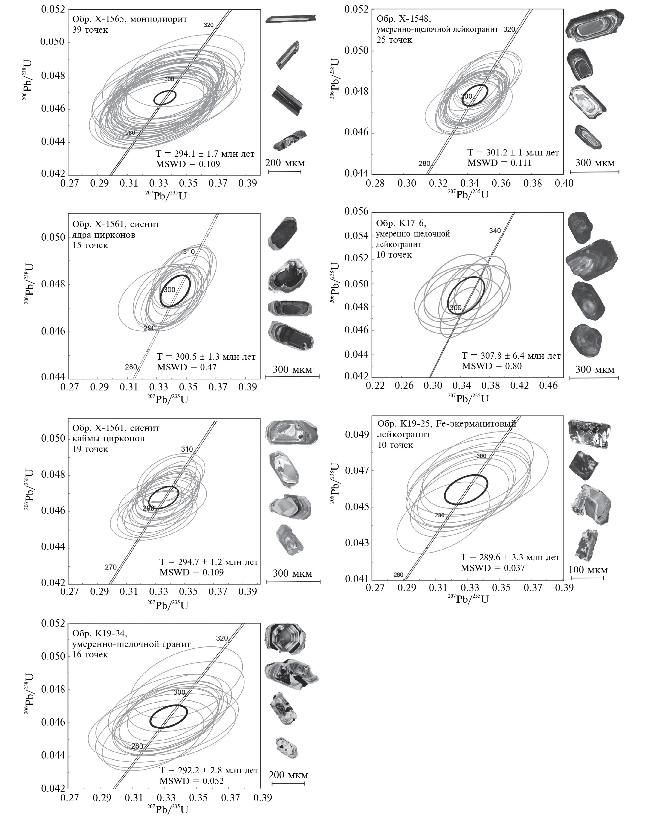 Сиениты (обр. X-1561) содержат крупные (200–300 мкм) зерна цирконов призматического габитуса с развитыми дипирамидами. Особенностью цирконов из сиенитов является наличие ядер – в катодолюминесцентных изображениях центральные части зерен представлены более темными участками со слабовыраженной зональностью или без нее, часто округлой формы. Ядра обрастают более светлой каймой с осцилляторной зональностью, также присутствуют зерна с осцилляторной зональностью без ядер. U-Pb датирование проводилось как для участков с осцилляторной зональностью, так и для ядер. Возраст, полученный по цирконам без ядер и краевым частям зерен, равен 295 ± 1 млн лет по 19 точкам; возраст ядерных частей цирконов несколько древнее – 301 ± 1 млн лет.