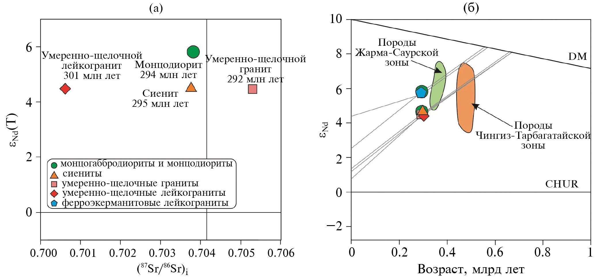 Монцогаббродиориты и монцодиориты характеризуются пониженным содержанием кремнезема, повышенными содержаниями мафических компонентов (см. рис. 5), слабовыраженными Eu- и Nb-минимумами, высокими изотопными значениями εNd(Т) = +4.57 и +5.82. Вероятнее всего, они произошли из родоначальных базитовых магм мантийного происхождения. Судя по высоким концентрациям легких лантаноидов, Rb, Ba и K2O, родоначальные базитовые магмы являлись субщелочными и высококалиевыми. По совокупности геохимических характеристик они могут быть сопоставлены с внутриплитными базальтами или базальтами океанических островов (рис. 10г). Аналогичными геохимическими характеристиками обладают раннепермские ультрабазит-базитовые породы, формирующие малые интрузии агримбайского и максутского комплексов, участвующие в строении многофазных габбро-монцодиорит-гранитных плутонов в сопряженной Чарской зоне Восточного Казахстана (Khromykh et al., 2019). Вероятным источником базитовых магм могла являться литосферная мантия, подстилающая орогенное сооружение (Хромых, 2022).