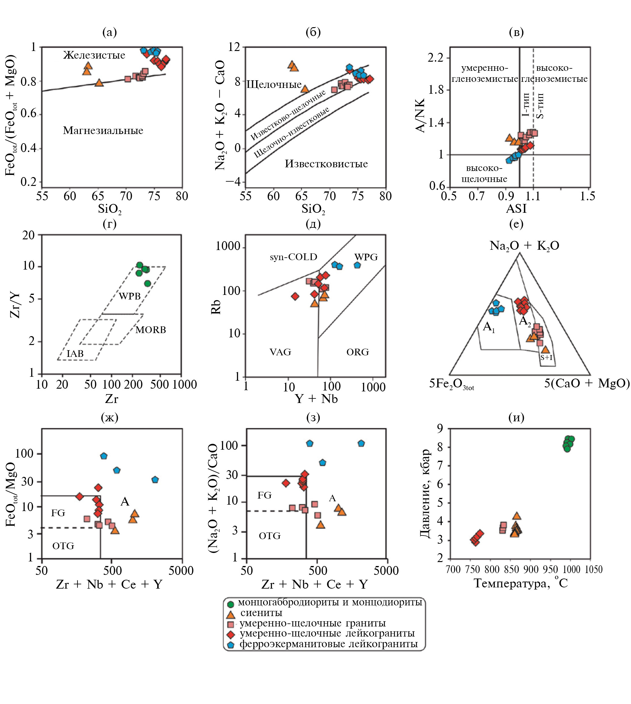 Рис. 10. Геохимическая классификация гранитоидов массива Акжайляу на диаграммах. (а) SiO2—FeOtot/(FeOtot + MgO) (Frost et al., 2001); (б) SiO2—MALI (Frost et al., 2001); (в) Al2O3/(CaO + Na2O + K2O)—ASI, мол. кол. (Frost et al., 2001); (г) Zr–Zr/Y (Pearce, Norry, 1979) поля IAB – островодужные базальты, MORB – базальты срединно-океанических хребтов, WPB – внутриплитные базальты; (д) Rb–(Y + Nb) (Pearce et al., 1984) поля VAG – граниты вулканических дуг, syn-COLG – граниты коллизионных орогенов, WPG – внутриплитные граниты, ORG – граниты океанических хребтов; (е) (Na2O + K2O)—Fe2O3tot × 5– (CaO + MgO) × 5, мол. кол. (Гребенщиков, 2014); (ж) Zr + Nb + Ce + Y vs. FeOtot/MgO (Whalen et al., 1987) поля FG – фракционированные граниты, OTG – нефракционированные граниты; (з) Zr + Nb + Ce + Y vs. (Na2O + K2O)/CaO (Whalen et al., 1987); (и) результаты определения P-T параметров формирования пород массива Акжайляу.