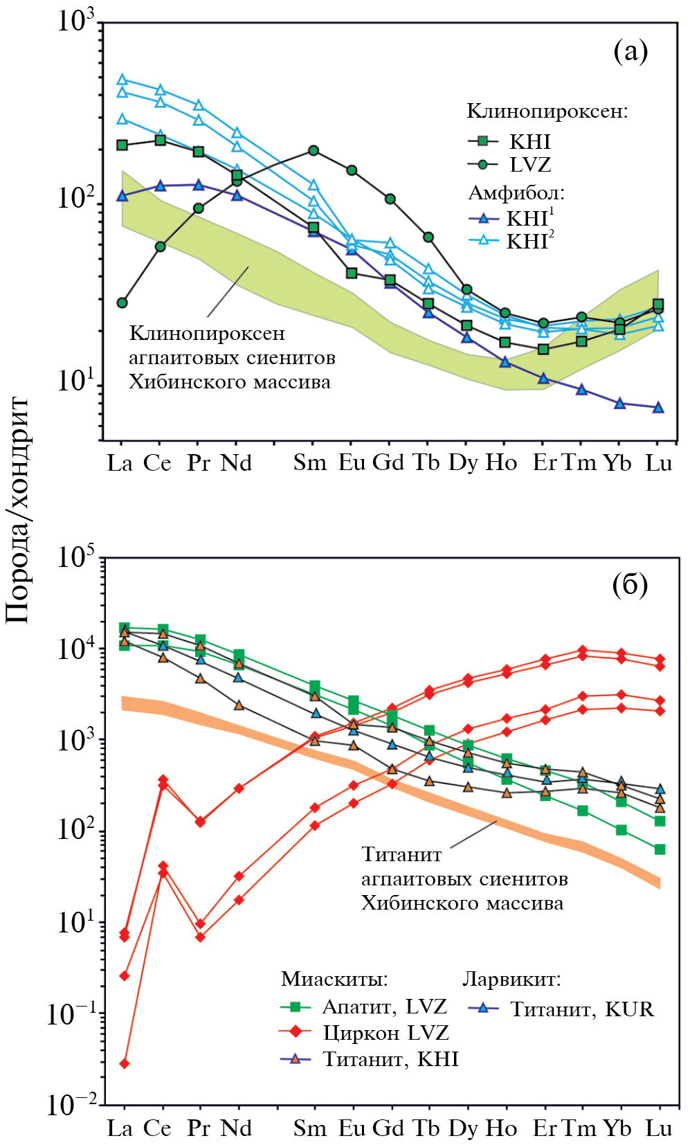 Рис. 2. Графики распределения хондрит-нормализованных значений редкоземельных элементов в клинопироксенах, амфиболах (а) и акцессорных минералах (б) миаскитовых сиенитов Хибинского (KHI), Ловозерского (LVZ) и Кургинского (KUR) массивов. Показаны графики REE для раннего амфибола KHI1 и амфибола, замещающего клинопироксен KHI2. Поля на рисунках (а) и (б) – распределение REE соответственно в клинопироксенах и титанитах в К-нефелиновых сиенитах и фоидолитах Хибинского массива (Арзамасцев и др., 2005). Нормализовано по (Anders, Grevesse, 1989).