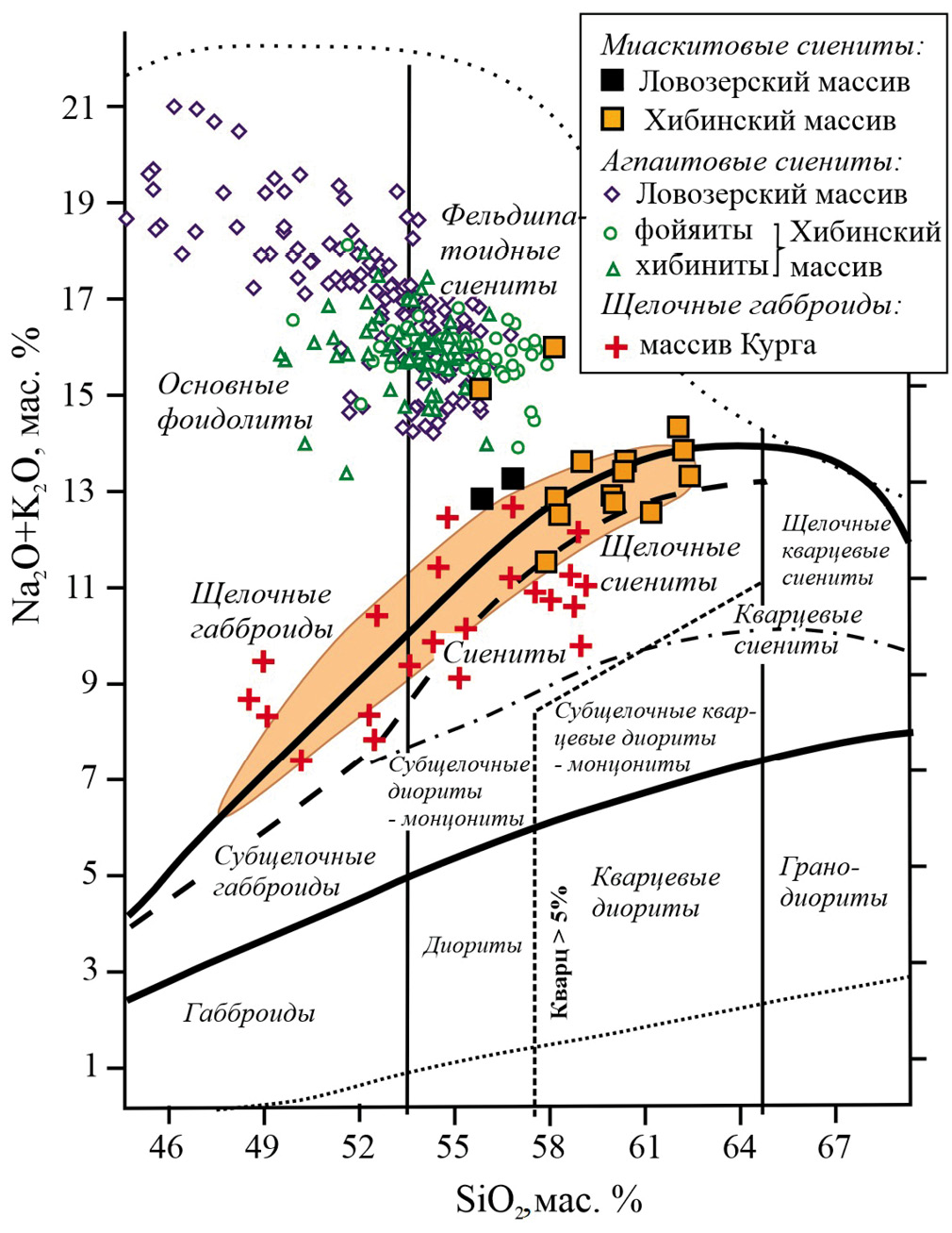 Переход от миаскитовых к агпаитовым сериям в массивах Кольской провинции мог быть обусловлен сменой минеральных парагенезисов, вызванной драматическим изменением окислительно-восстановительных условий и развивался по сценарию, предложенному в (Marks et al., 2011). Показано, что выделение арфведсонита или эгирина вместо фаялита или магнетита (ильменита), которое контролируется летучестью кислорода и активностью Na в кристаллизующихся расплавах, определяет два основных направления эволюции агпаитовых расплавов: высококальциевый тренд, пример которого представлен щелочными породами Кольской провинции, и тренд истощения Ca, который проявляется, например, в щелочных породах провинции Гардар, Южная Гренландия (Marks et al., 2011). Обе тенденции показывают значительное обогащение Na во время магматической эволюции. В Кольской провинции этот тренд, по-видимому, реализован в Кургинской интрузии, где в полном объеме представлена ларвикит-лардалит-сиенитовая серия. Если высококальциевые агпаитовые сиениты были образованы из нефелинитовых исходных расплавов, в которых не кристаллизовалось большое количество плагиоклаза, то Са-деплетированные сиениты могли возникнуть в результате обширного фракционирования плагиоклаза из исходных щелочно-базальтовых расплавов. Различия в условиях кристаллизации определяют и минералогические различия внутри этих групп пород и связаны с кристаллизацией минералов-концентраторов HFSE: большинство сиенитовых пород, известных как миаскиты/пуласкиты, содержат циркон, титанит или ильменит в качестве минералов, богатых HFSE, тогда как в агпаитовых сиенитах высокозарядные элементы формируют собственные Ti и Zr минеральные фазы – эвдиалит, катаплеит, эльпидит, энигматит, астрофиллит и др. (Marks et al., 2011).