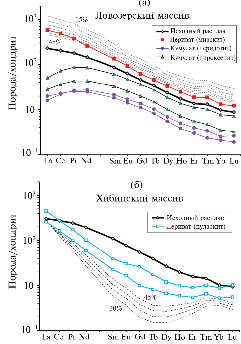 Рис. 9. Распределение нормализованных к хондриту содержаний редкоземельных элементов в исходном анкарамитовом расплаве (обр. 107/111 из вулканогенной толщи кровли Ловозерского массива) и продуктах его фракционной кристаллизации: (а) миаскита Ловозерского массива (обр. 903/978) и вероятных комплементарных реститах (перидотит, обр. 6/299, 8/211 и пироксенит обр. 6/325, 2/41.5 из массива Курга по данным (Арзамасцев и др., 1999); (б) пуласкита Хибинского массива (обр. 642/145). Пунктиром показаны расчетные концентрации REE в процессе фракционной кристаллизации исходного расплава. Проценты на графике – доля фракционированного расплава.