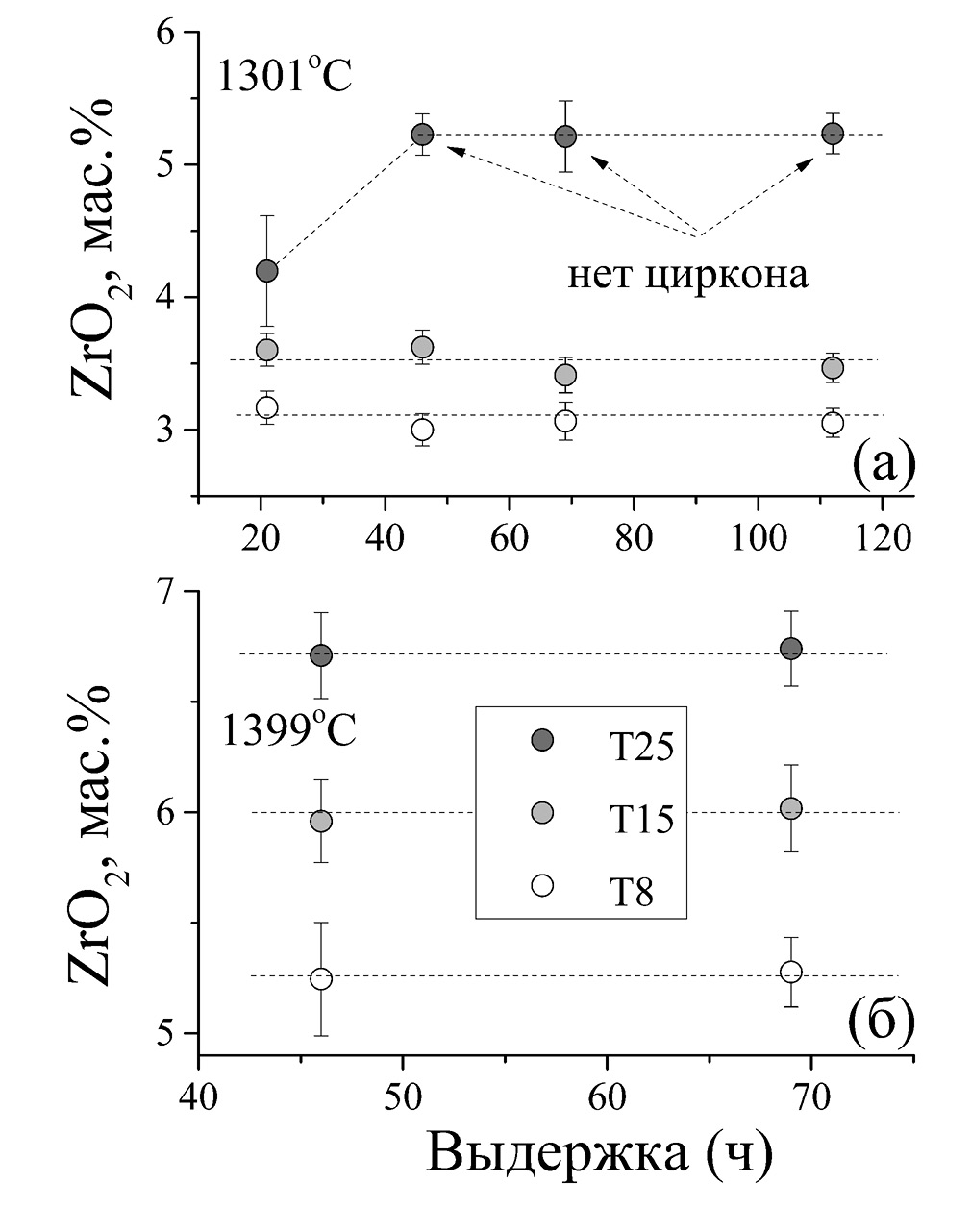 Рис. 1. Растворимость циркона в силикатном расплаве при 1301 (а) и 1399°C (б), в зависимости от выдержки эксперимента, в трех сериях с различным исходным содержанием TiO2. При 1301°C метастабильный циркон в расплаве, обр. T25, существует в самом непродолжительном опыте, но исчезает при более длительных выдержках.