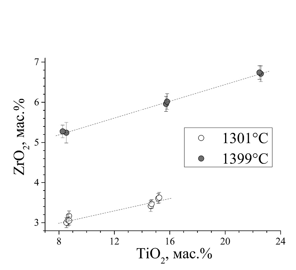 Влияние содержания титана на растворимость циркона. На рис. 2 продемонстрировано влияние содержания TiO2 на растворимость циркона в расплавах. Так, при 1400°C стекло T8 (TiO2 = 8.4 мас. %) содержит 5.3 мас. % ZrO2, стекло T15 (TiO2 = 15.8%) содержит 6.0% ZrO2, наконец, стекло T25 (TiO2 = 22.5 мас. %, в равновесии с цирконом и рутилом) содержит уже 6.7 мас. % ZrO2. Подобная зависимость растворимости циркона от содержания оксида титана была ранее описана в работе (Borisov, Aranovich, 2019).