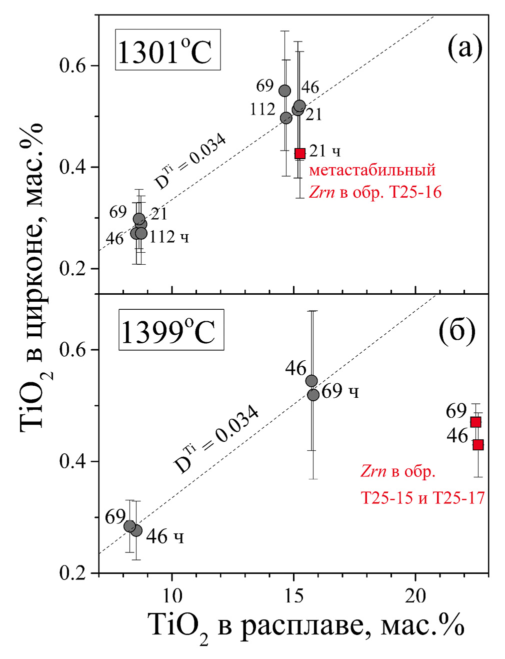 Хотя нас интересует равновесное содержание титана в цирконах, равновесие циркон/расплав в отношении ZrO2 (рис. 1) является, пожалуй, минимальным признаком того, что требуемое равновесие достигнуто. При 1300°C составы T8 и T15 имеют на ликвидусе циркон, а расплавы демонстрируют одинаковое в пределах ошибки содержание ZrO2 для всех выдержек, от 21 до 112 ч. Образцы T25, богатые TiO2, демонстрируют иное поведение. Длительные опыты (≥46 ч) не имеют циркон на ликвидусе, и лишь в непродолжительном эксперименте обнаруживается циркон (рис. 1а). Мы полагаем, что этот циркон метастабильный и не используем его в дальнейшем обсуждении. Хочется подчеркнуть, что даже 21-часовая выдержка при относительно высокой температуре 1300°C может оказаться недостаточной для достижения фазового равновесия в столь высокотитанистых образцах. При 1400°C все образцы, включая T25, имеют на ликвидусе циркон и демонстрируют сходное содержание ZrO2 в расплавах в опытах длительностью 46 и 69 ч (рис. 1б).