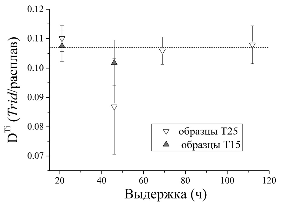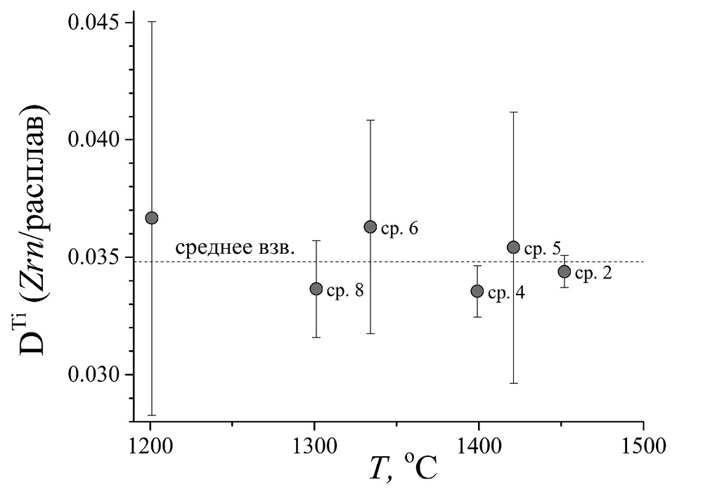 В недавней работе по растворимости циркона в силикатных расплавах (Borisov, Aranovich, 2019) авторы использовали, среди прочих, модельные высокотитанистые расплавы. Выборочный микрозондовый анализ Ti в этих экспериментальных цирконах показал большой разброс значений DTi вне зависимости от температуры. Однако все коэффициенты оказались меньше единицы.