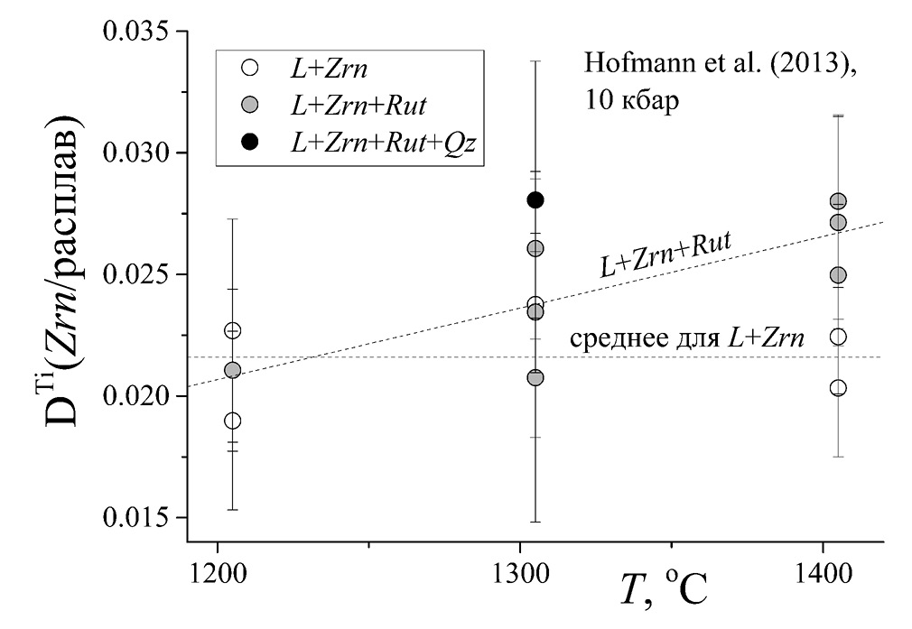 Сведения о коэффициенте распределения титана между цирконом и силикатным расплавом (DTi) противоречивы. Так, в работе (Thomas et al., 2002) проанализированы на ионном зонде расплавные включения в цирконах из грубозернистых кварц-биотит-роговообманковых диоритов и рассчитаны значения DTi, оказавшиеся необычайно высокими (3.2–16.8). В свою очередь, (Luo, Ayerst, 2009) выполнили эксперименты по распределению редких и малых элементов (в том числе Ti) между цирконом и водосодержащим высокощелочным риолитовым расплавом и рассчитали DTi = 0.5–3.8. Наконец, (Hofmann et al., 2013) в опытах при 1200–1400°C показали, что DTi заведомо ниже единицы и практически не зависит от температуры.