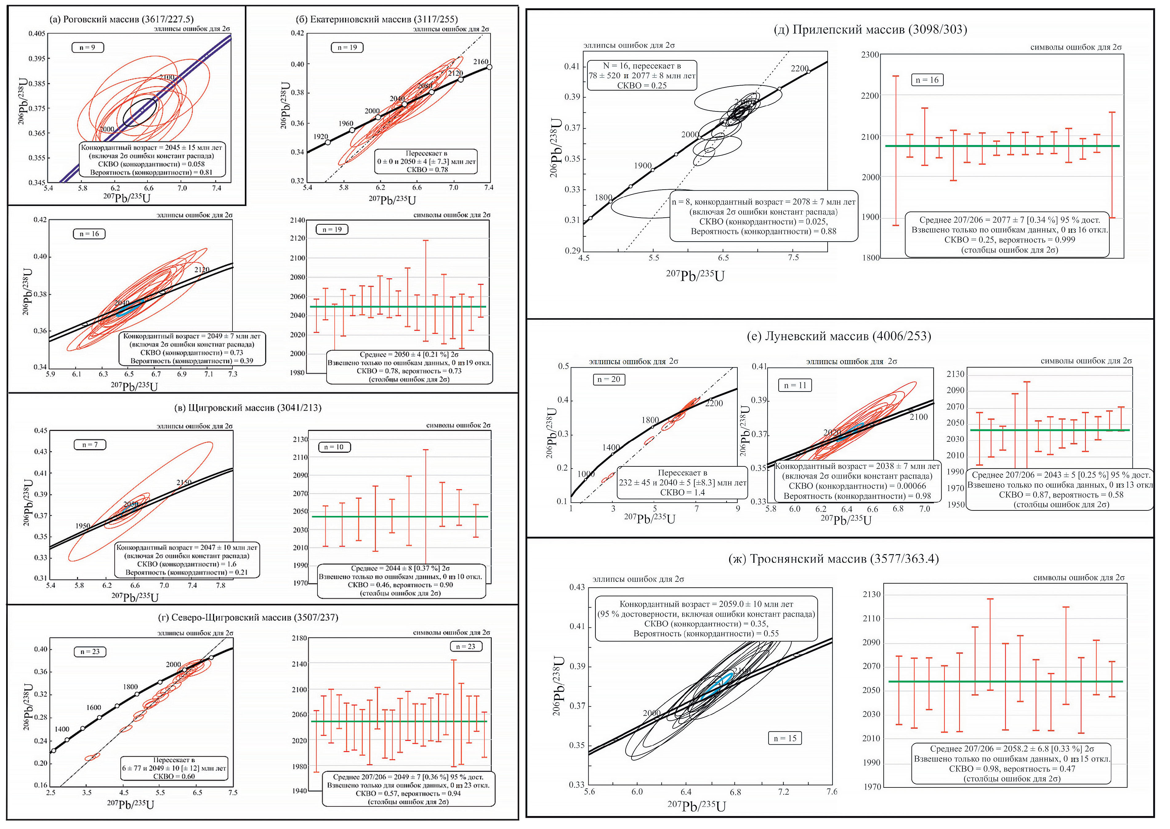 Рис. 15. Результаты U-Pb датирования цирконов из гранитоидов методом SIMS.
