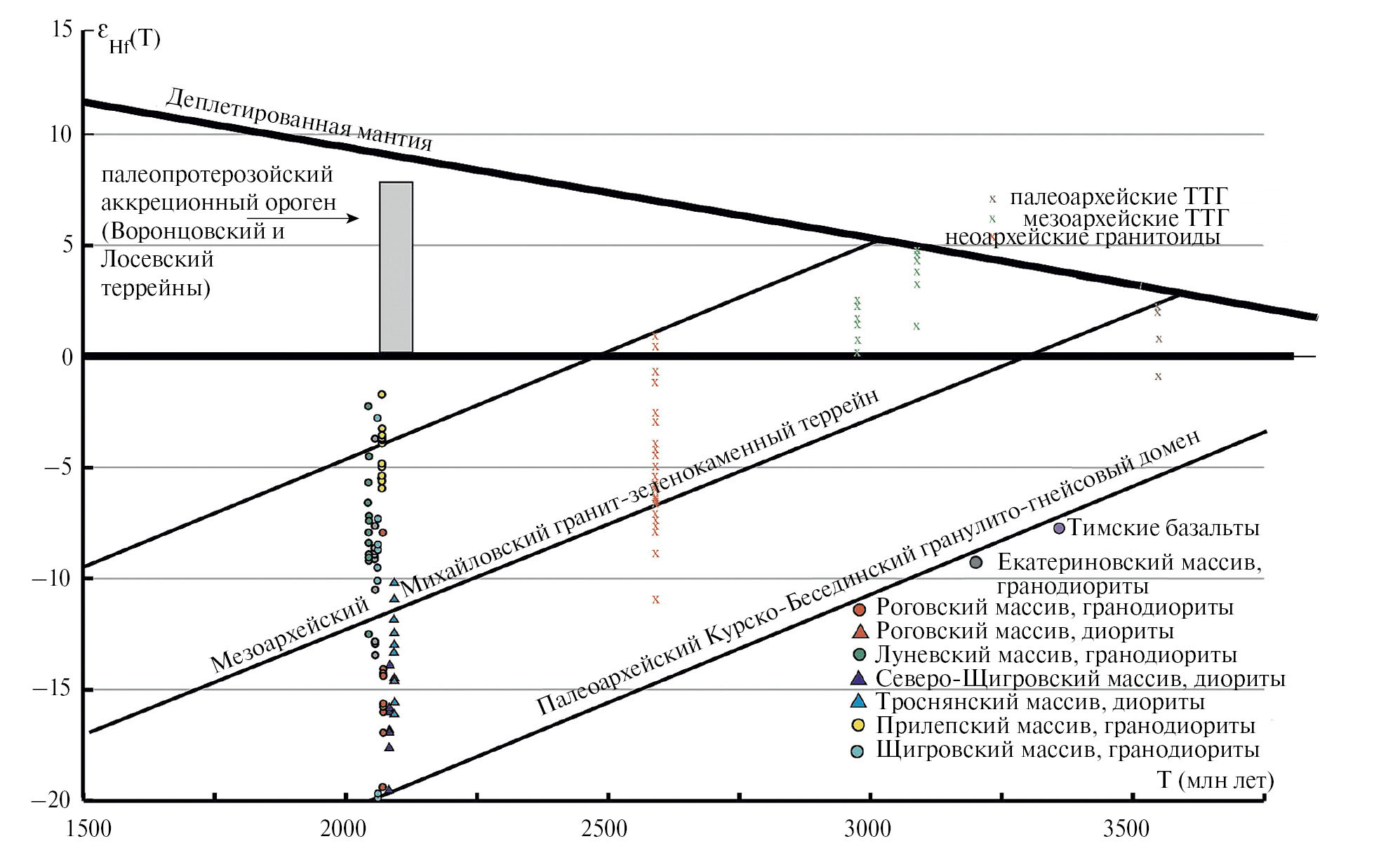 На восточной окраине архейского Курского блока Сарматии широко проявлен палеопротерозойский диорит-гранодиоритовый магматизм с возрастом 2.04–2.08 млрд лет. Гранитоиды интрузивных массивов являются метаглиноземистыми известково-щелочными породами I-типа, обогащены несовместимыми элементами (LILE и LREE), с отрицательными Ti-, P- и Nb-аномалиями. Они характеризуются широким диапазоном отрицательных значений εNd(T) в породах и εHf(T) в цирконах и глубин зарождения расплавов с гетерогенными архейскими нижнекоровыми базитовыми источниками. Наиболее низкорадиогенные древние коровые источники имеют диориты. Гранодиориты имеют палео- и мезоархейские и более ювенильные неоархейские источники. Причиной интенсивного магматизма с возрастом около 2.06 млрд лет был подъем астеносферной мантии при разрушении пододвинутой океанической плиты в результате пологой субдукции. Ее разрушение и мафический андерплэйтинг привели к внутрикоровому плавлению в верхней плите, состоящей из спаянных в результате предшествовавшей аккреции разновозрастных фрагментов архейской и палеопротерозойской коры. Диорит-гранодиоритовые магмы образовались в разноглубинных очагах плавления в древней архейской коре на окраине Курского блока с вовлечением в источники расплавов фрагментов палеопротерозойской литосферы Восточно-Сарматского орогена.