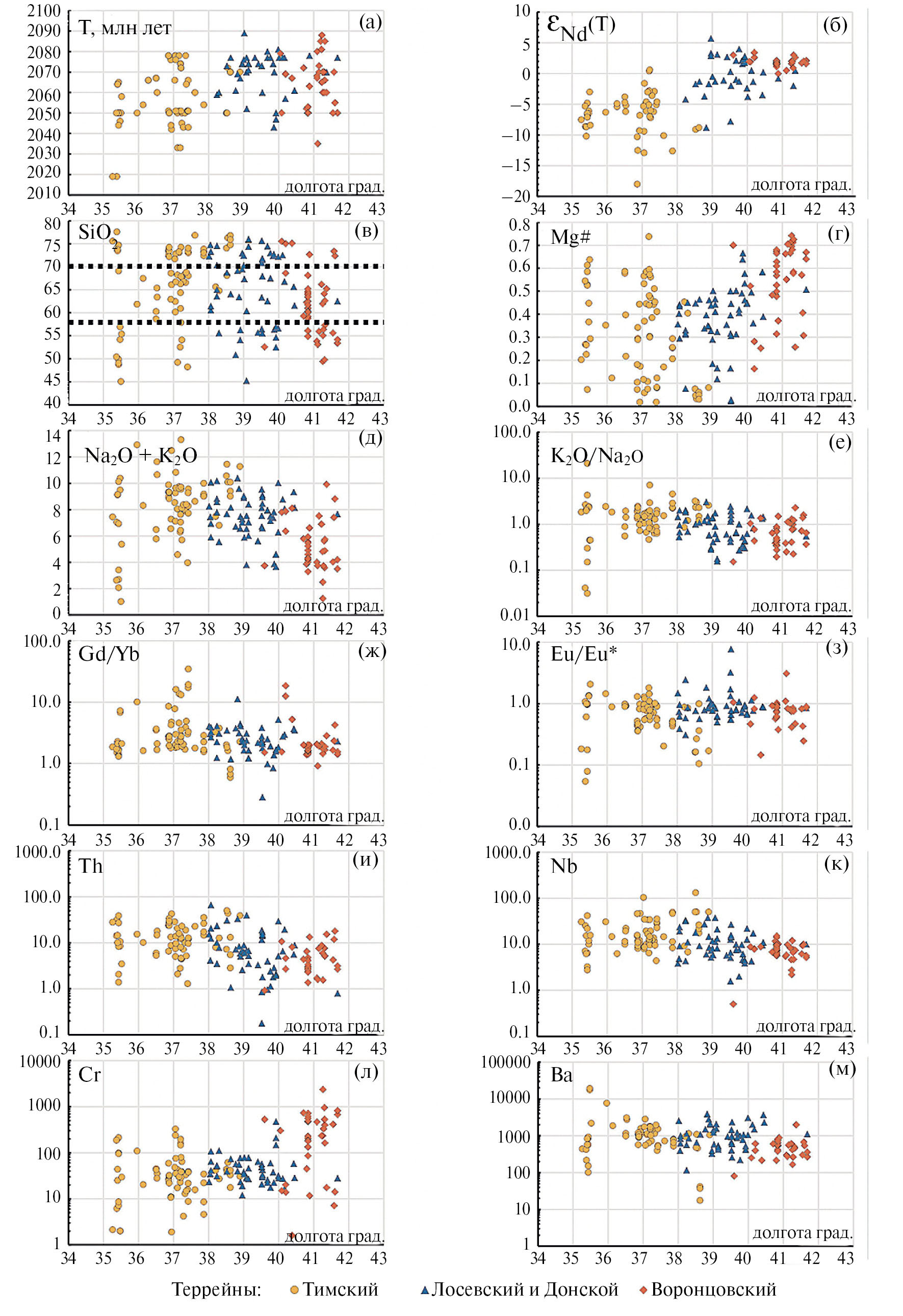 Изотопно-геохронологические исследования циркона (TIMS) были выполнены только для двух проб гранодиоритов из небольших интрузивных тел. Возраст магматизма оценивался как 2046–2086 млн лет) (Артеменко, 1995). Оценки возраста двух массивов гранитоидов методом SIMS (2.04–2.05 млрд лет) и их изотопно-геохимическое изучение послужили основой для предположения о постколлизионной природе диорит-гранодиоритового магматизма в результате кристаллизационной дифференциации базальтовых магм, претерпевших умеренную контаминацию ТТГ-гнейсами (Савко и др., 2014б). В настоящей статье на основании результатов комплексных геолого-структурных, изотопно-геохимических и геохронологических исследований и петрологических реконструкций для всех крупных гранитоидных массивов Тимского террейна и их сравнения с возрастными аналогами в других террейнах Восточно-Сарматского орогена представлены ограничения на возможные тектонические модели формирования этой крупной гранитоидной магматической провинции среднего палеопротерозоя.