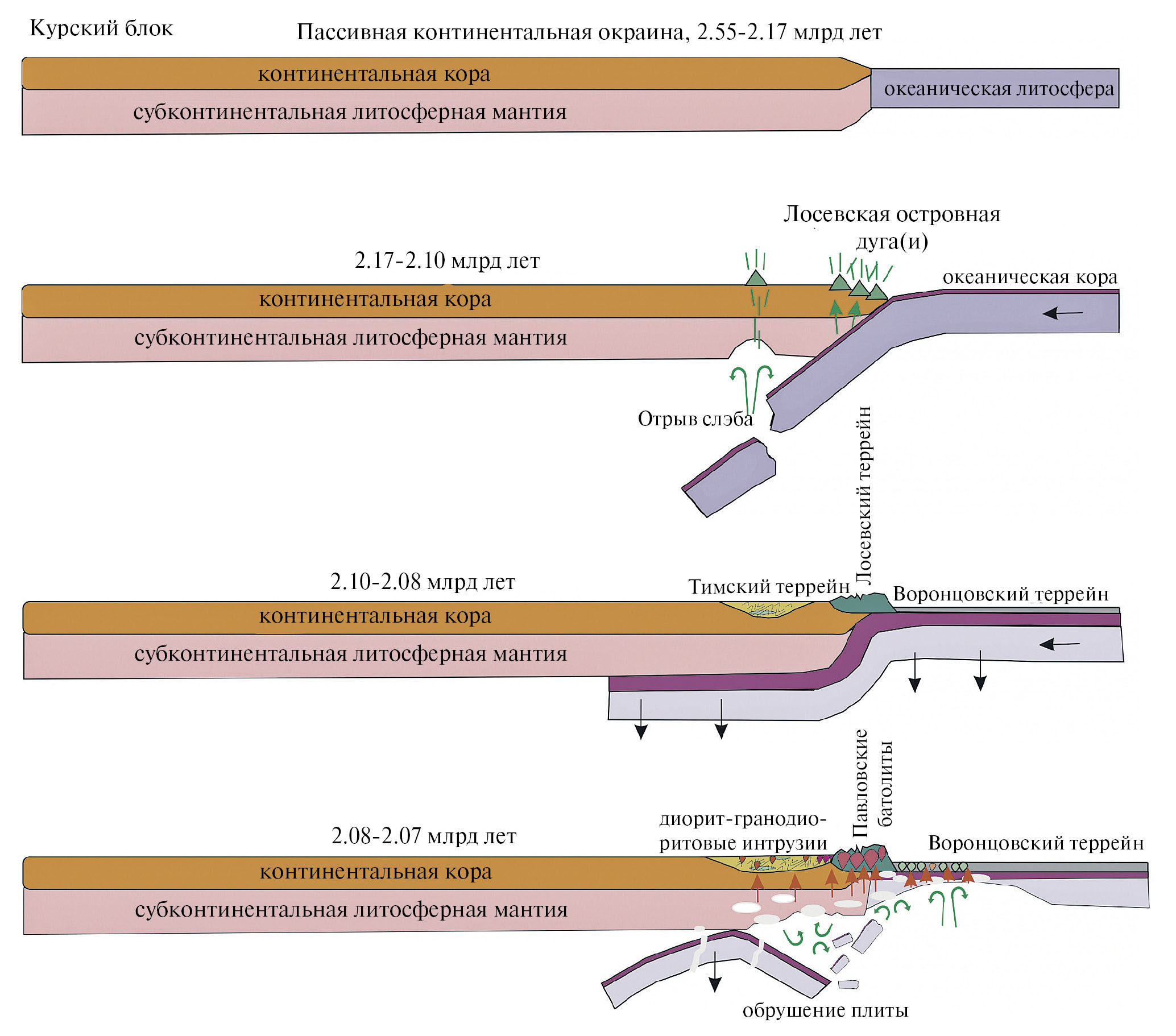 В Лосевском террейне преобладают осадочно-вулканогенные комплексы с возрастом 2.12–2.17 млрд лет, которые интерпретируются как система континентальных или аккретированных океанических вулканических дуг на восточной окраине Сарматии (Щипанский и др., 2007; Terentiev et al., 2017). Их прорывают и мигматизируют ювенильные гранитоиды I-типа усманского комплекса с возрастом 2.06–2.08 млрд лет, для которых предполагается как коллизионная, так и постколлизионная обстановки (Щипанский и др., 2007; Terentiev et al., 2016b).