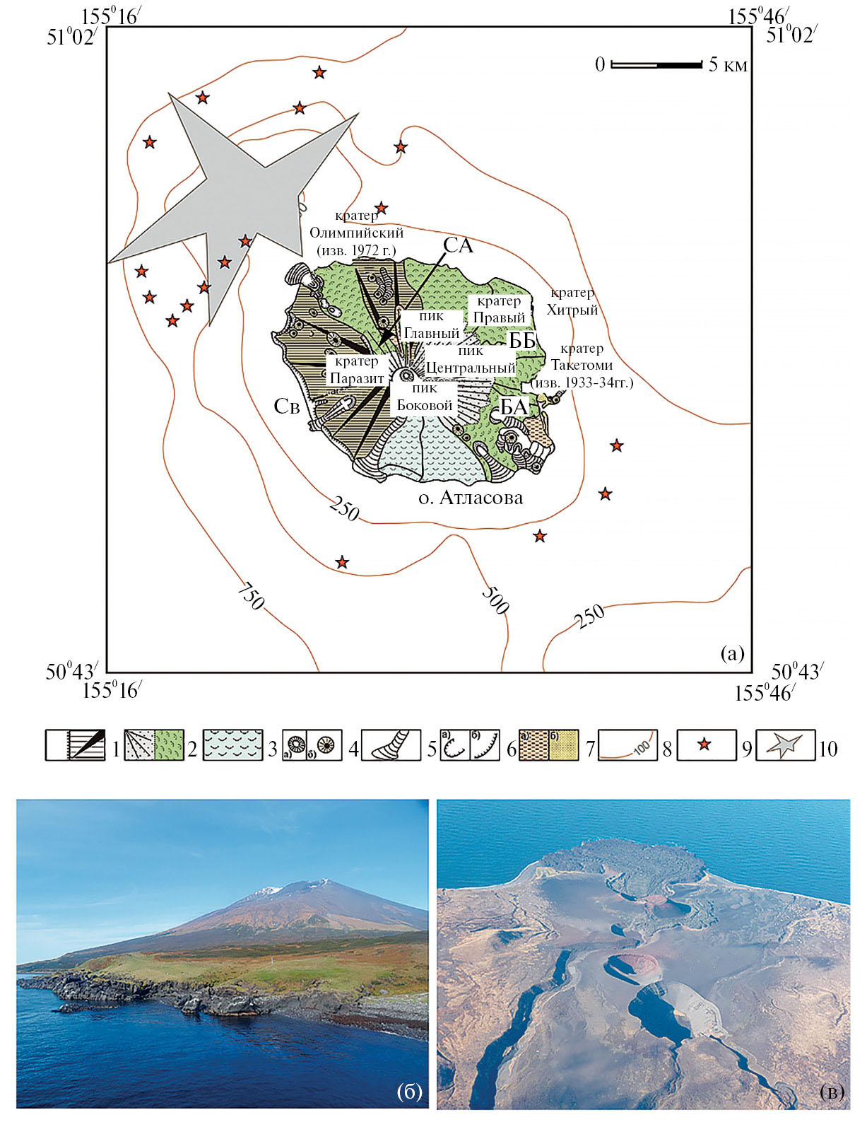 Рис. 2. Схема строения вулканического массива Алаид (а), по (Абдурахманов и др., 1978; Блох и др., 2006а, 2006б) с изменениями. 1 – древний конус вулкана Алаид; 2 – молодой конус вулкана Алаид и его лавовые потоки; 3 – лавовые потоки центрального конуса вулкана Алаид; 4 – терминальный (а) и побочные латеральные шлаковые конусы (б) вулкана Алаид; 5 – лавовые потоки внутреннего и побочных шлаковых конусов вулкана Алаид; 6 – кратеры (а) и эрозионные уступы (б) вулкана Алаид; 7 – морская терраса (а) и пирокластические образования кратера Такетоми (б); 8 – изобаты (м); 9 – подводные лавовые конусы; 10 – подводный вулкан Григорьева.