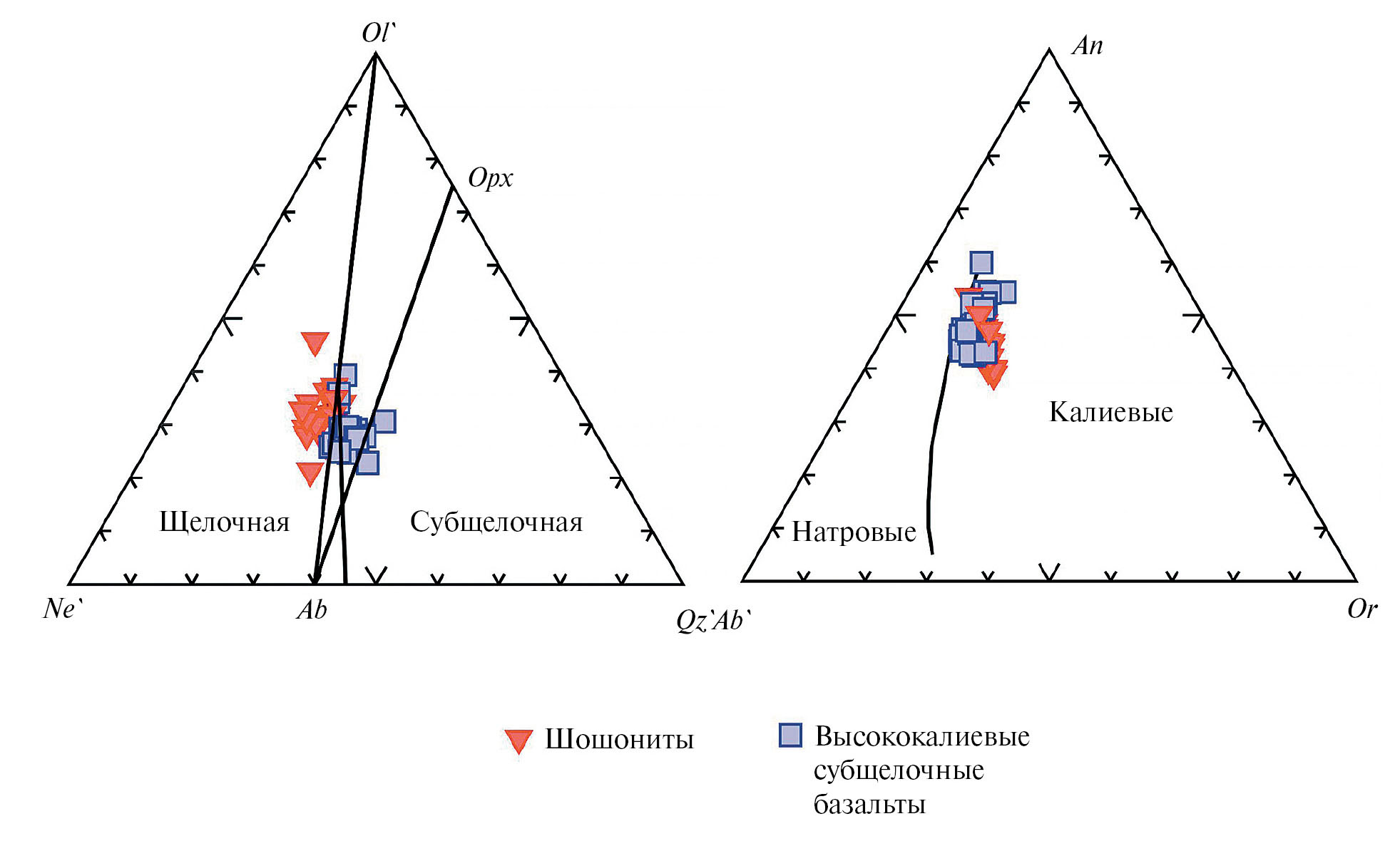 Авторами изучена наиболее представительная в настоящее время коллекция базальтов вулкана Алаид (см. Supplementary 1, ESM_1–Supplementary 3, ESM_3; рис. 2). Это позволило выделить два петрохимических типа – высококалиевые субщелочные базальты и Ne-нормативные шошониты (рис. 3), хотя на геохимических диаграммах между ними отсутствуют четкие границы (рис. 4а, 4б).